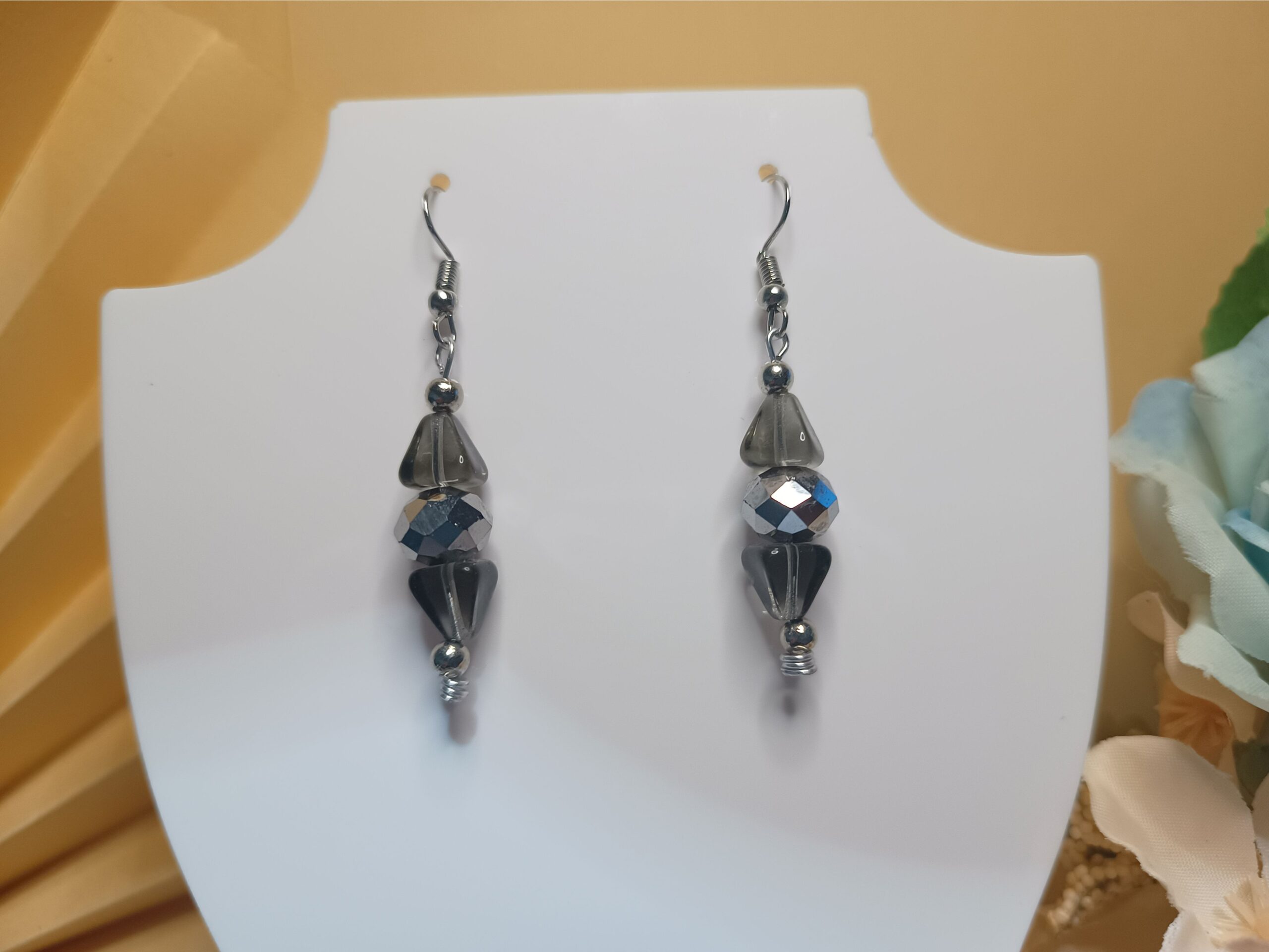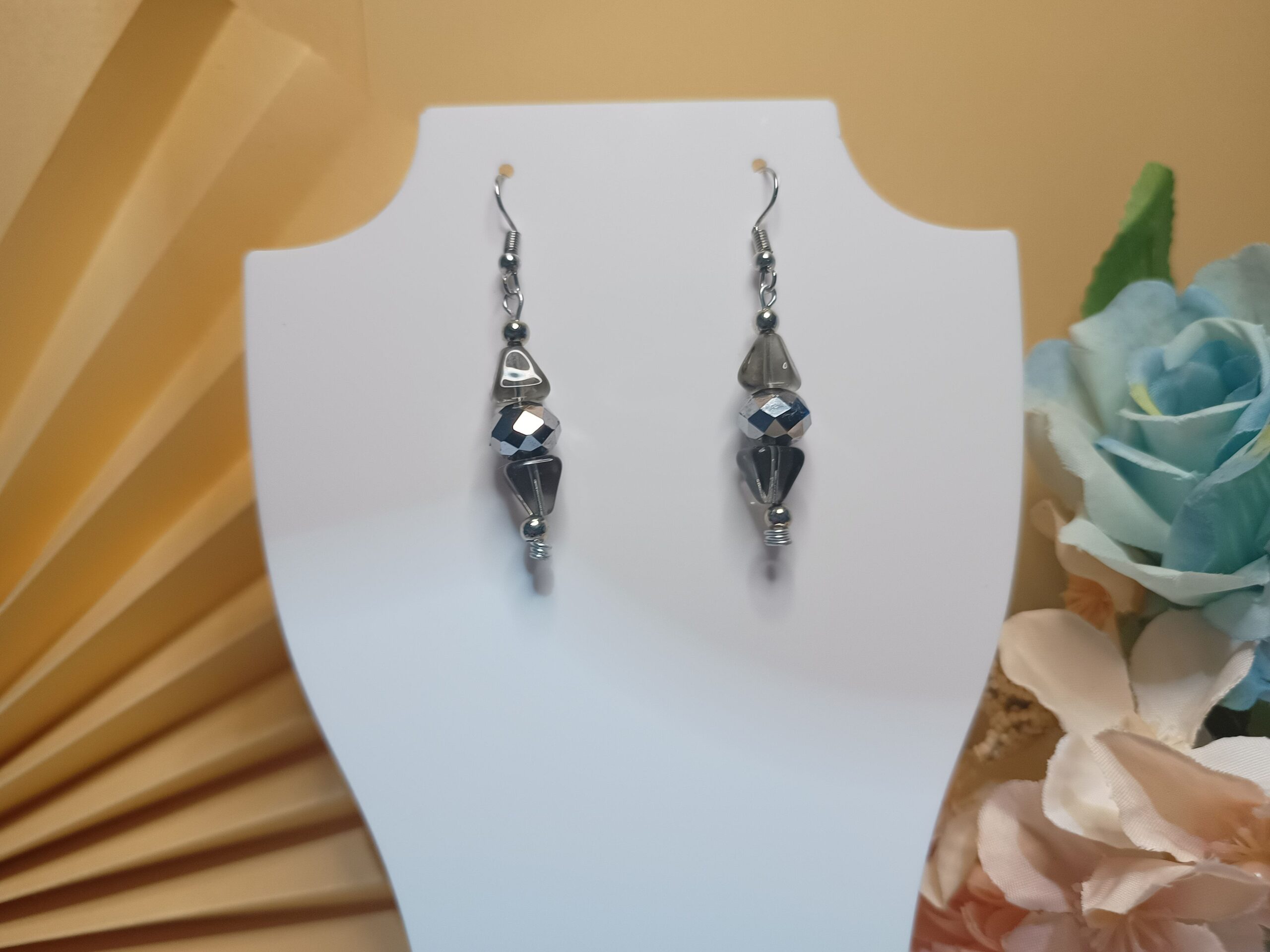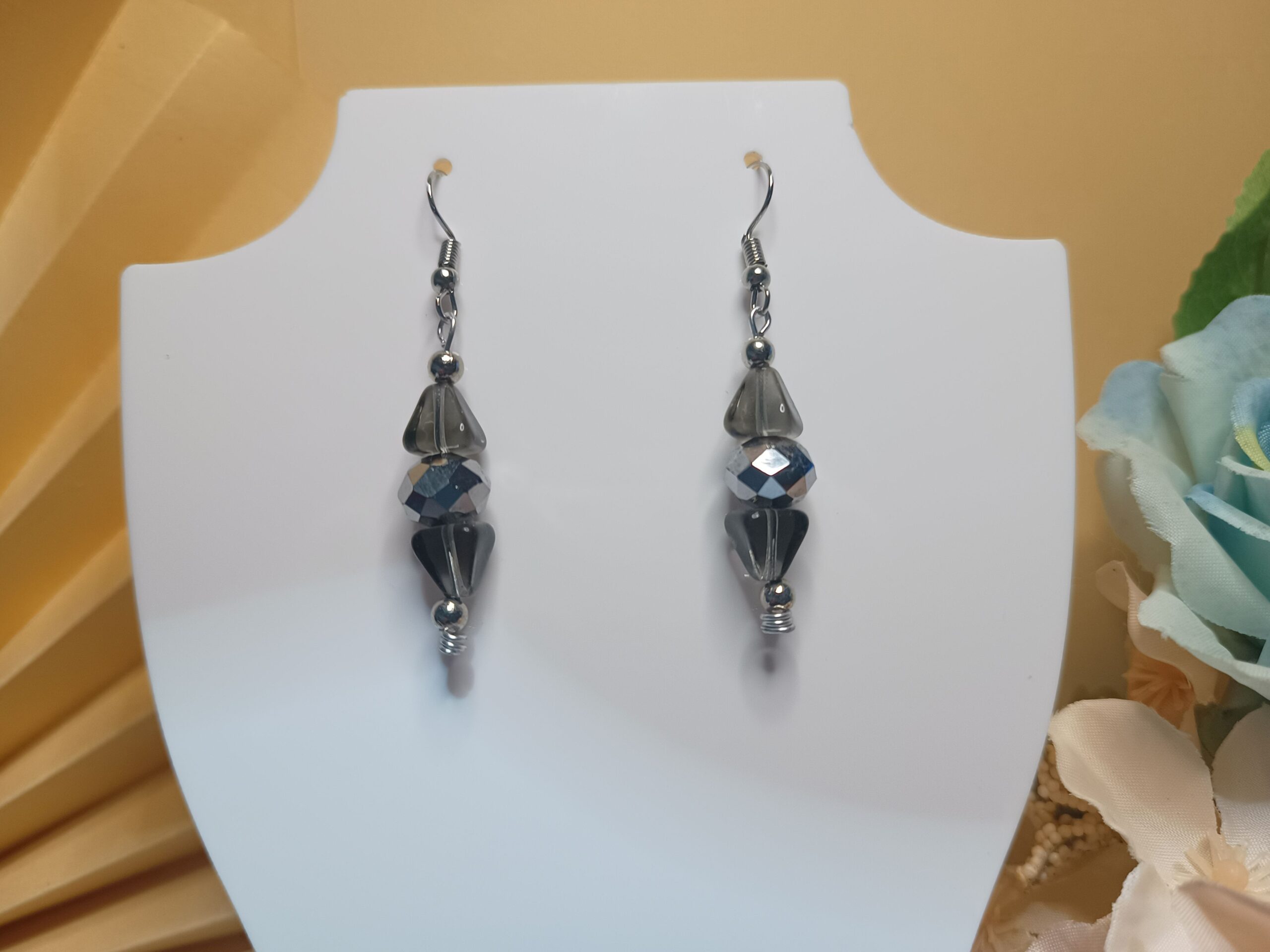 Brincos em cristais prateados e muranos em forma piramidal na cor fumê, com contas metálicas na cor prateada e base anzol