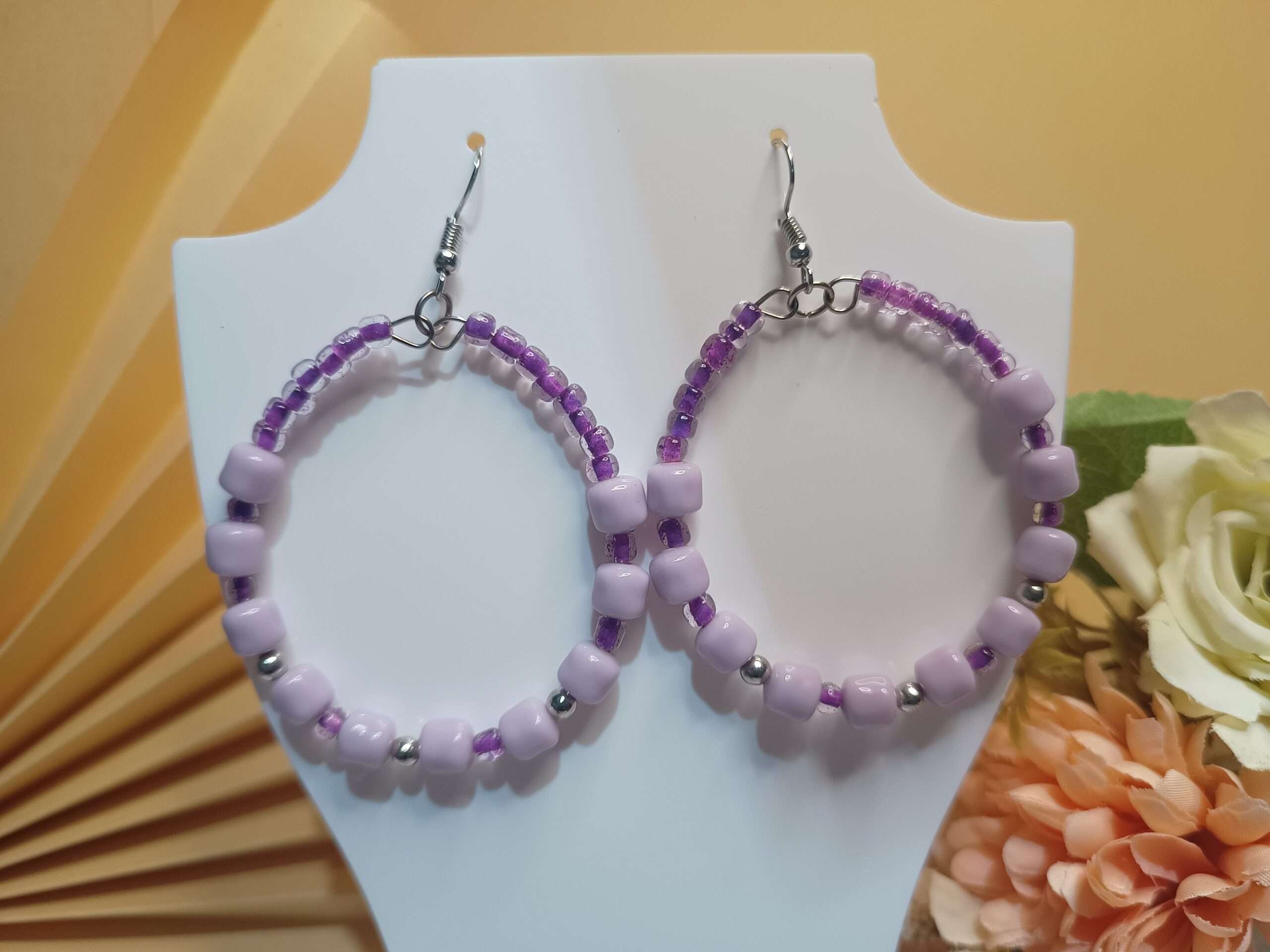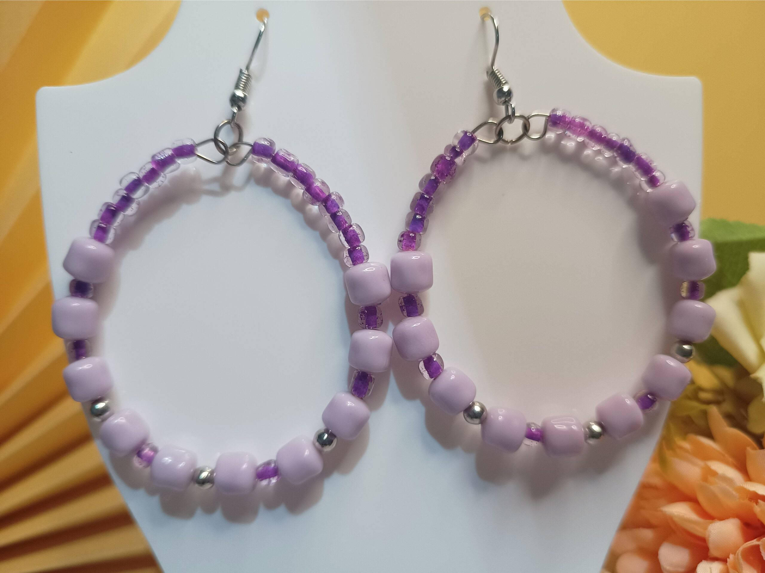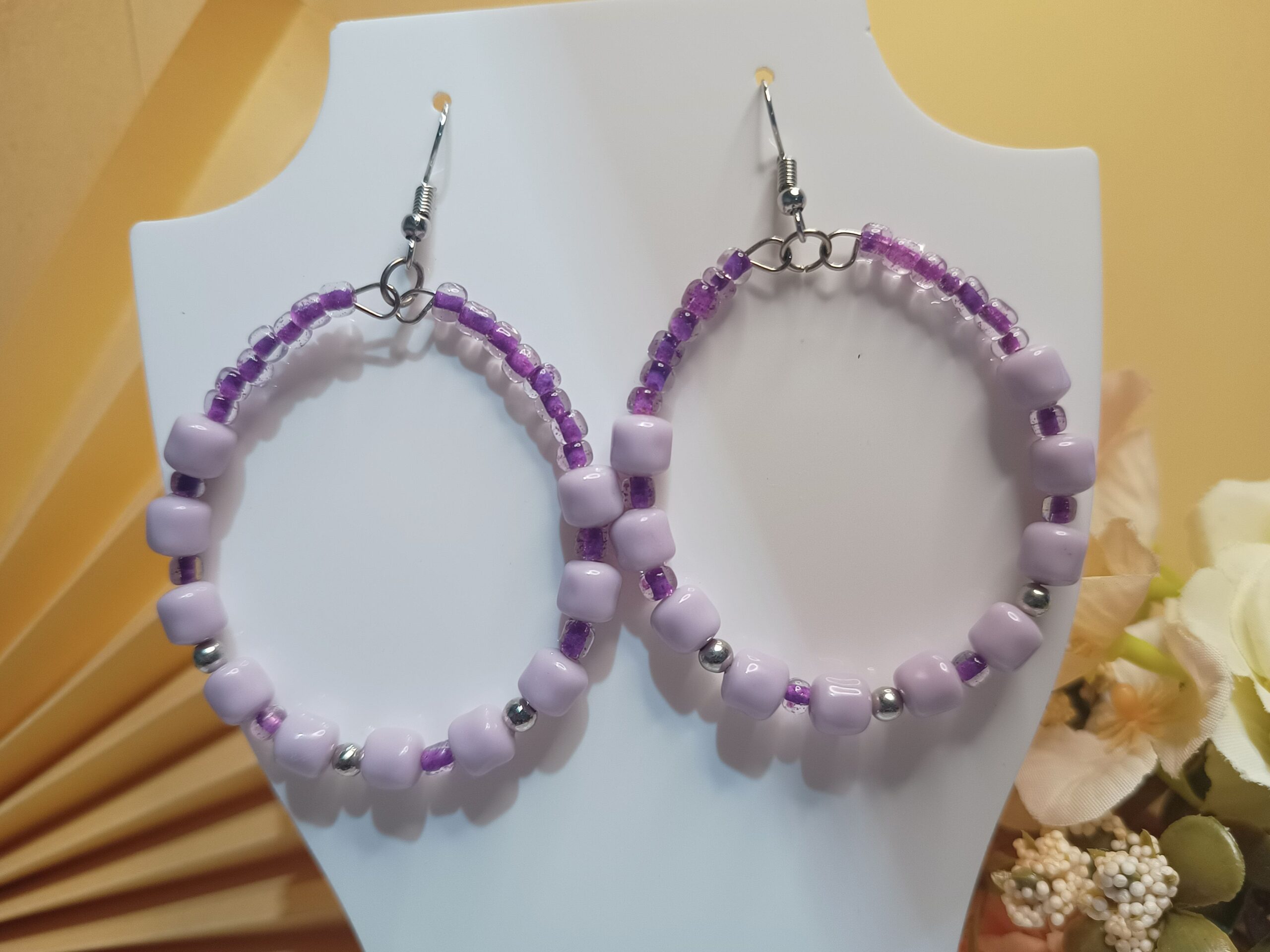Brincos em forma de argola, com miçangas na cor roxa, contas de resina na cor lilás e contas e base anzol prateados