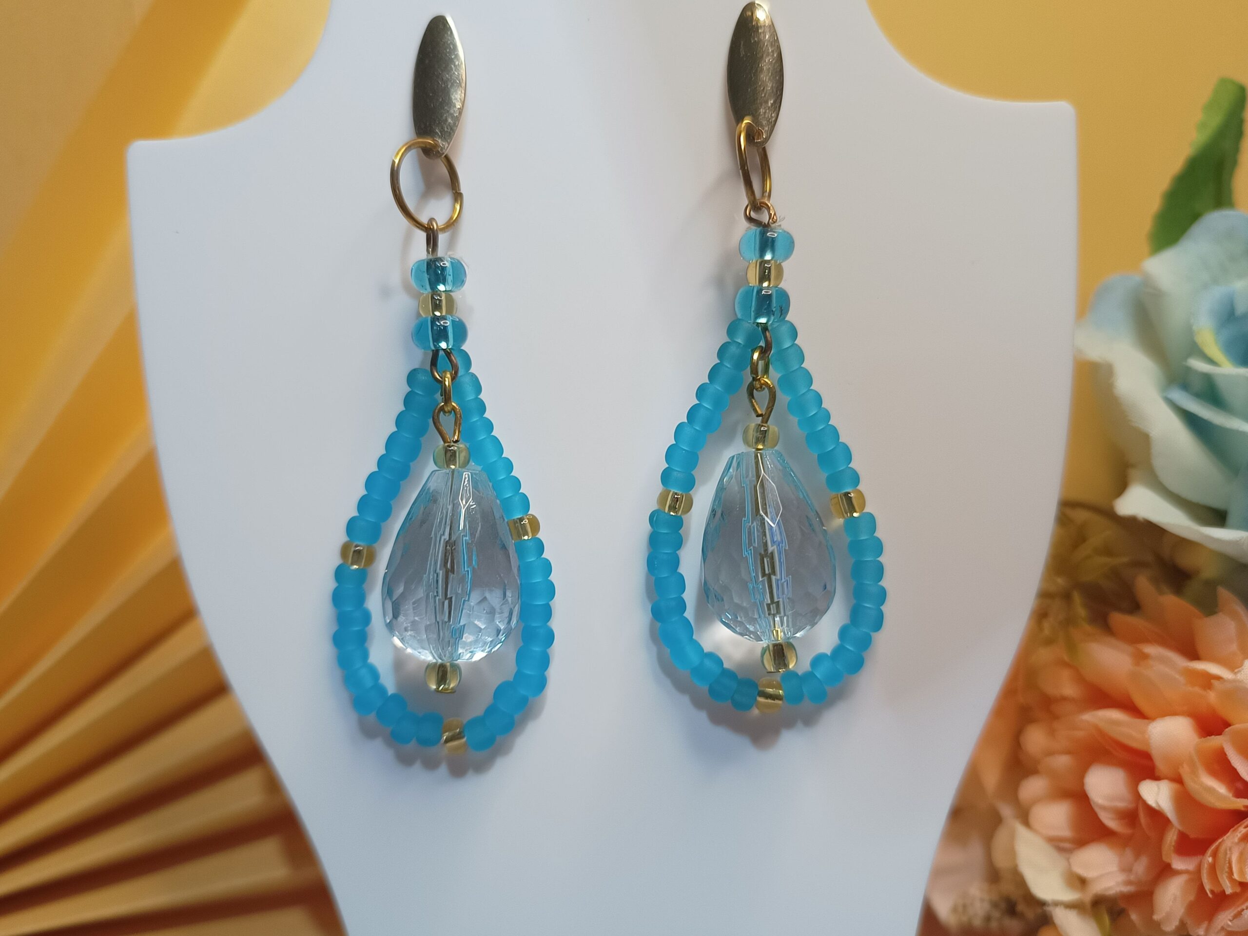 Seja a personificação do luxo! Com miçangas azuis e douradas e pingentes em forma de gota, este brinco é a escolha perfeita para quem busca um acessório que atrai olhares e exala requinte.