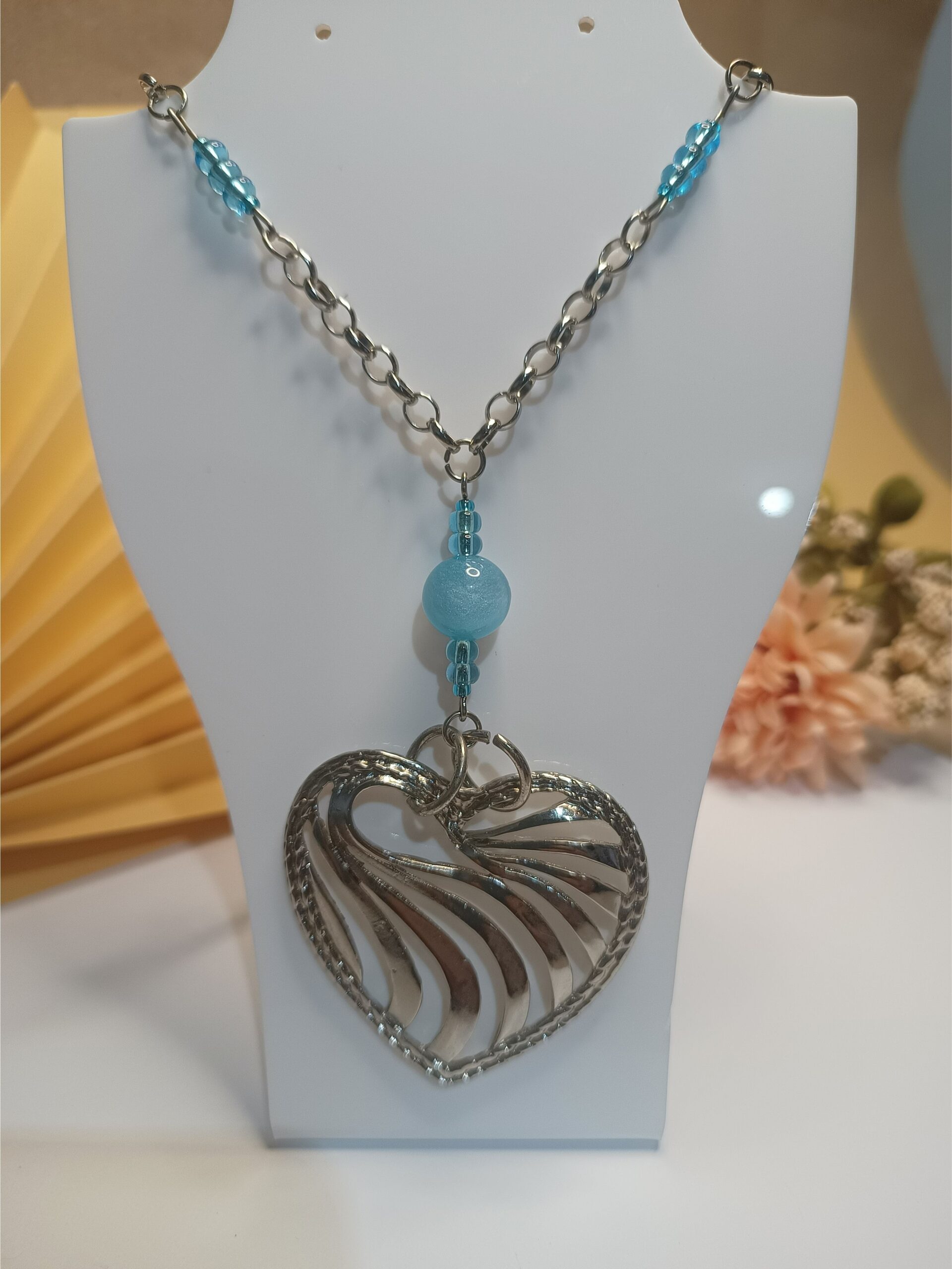 Colar com contas em azul com brilho cintilante, miçangas azuis, correntes prateadas premium e pingente de coração