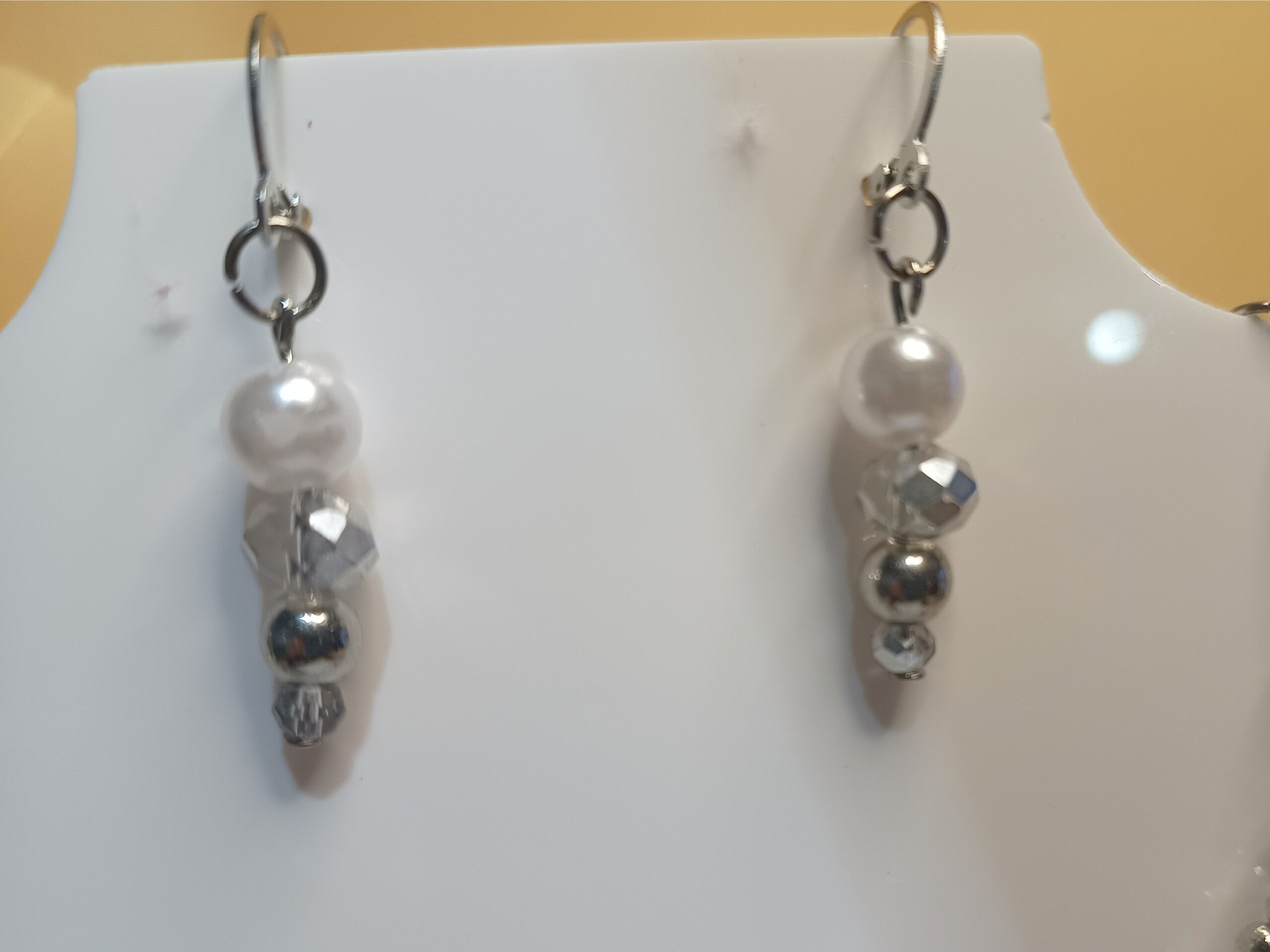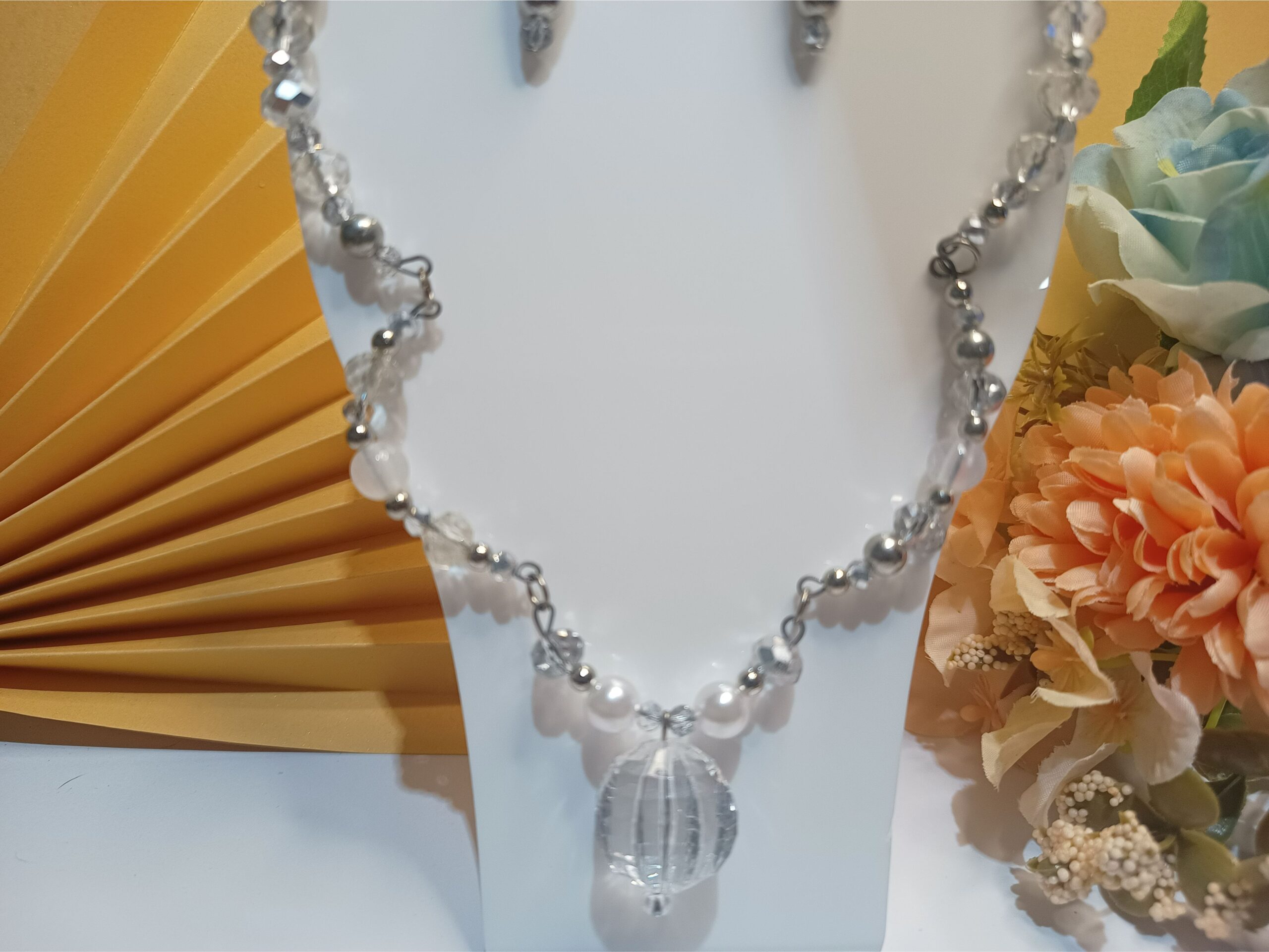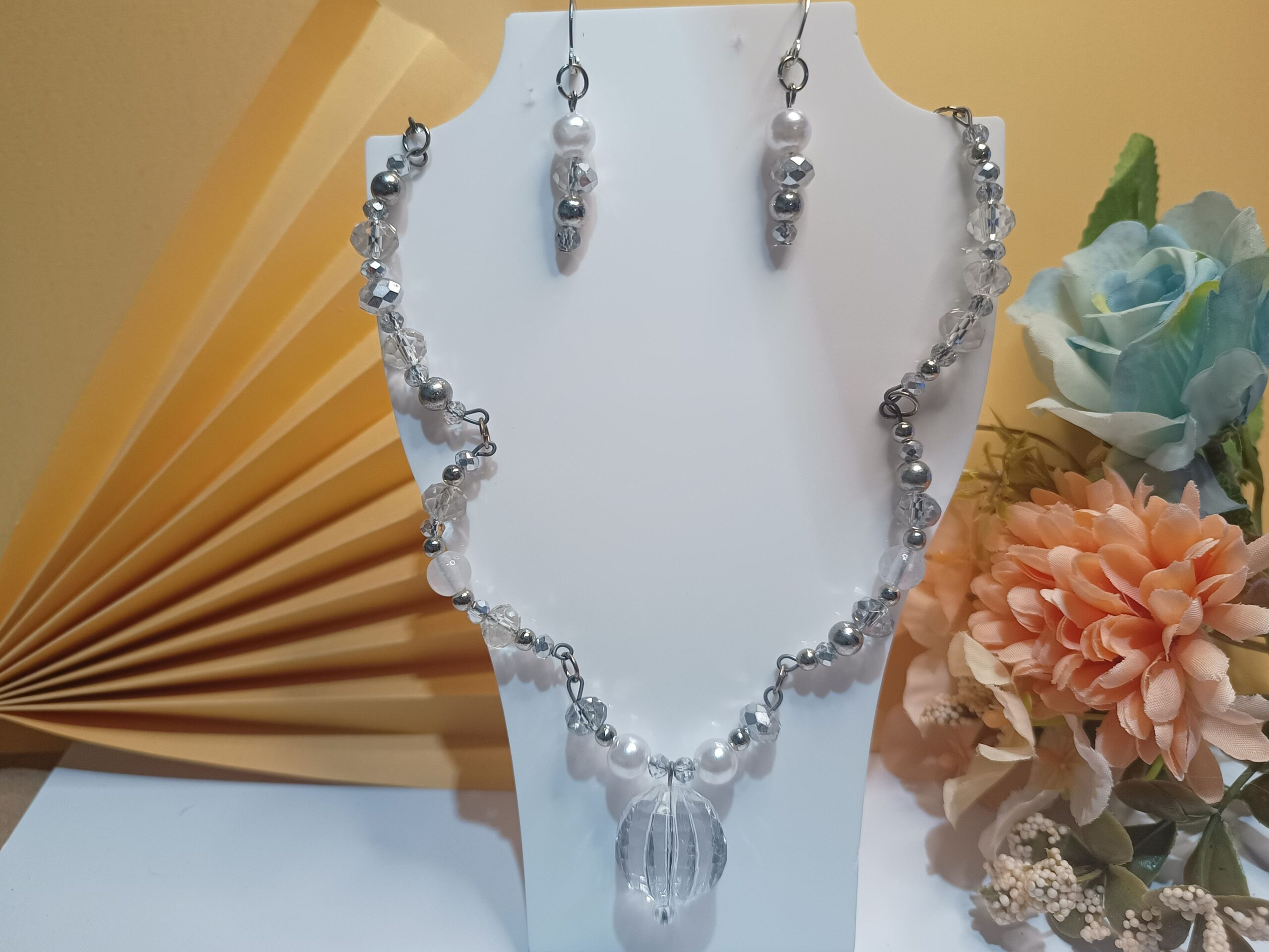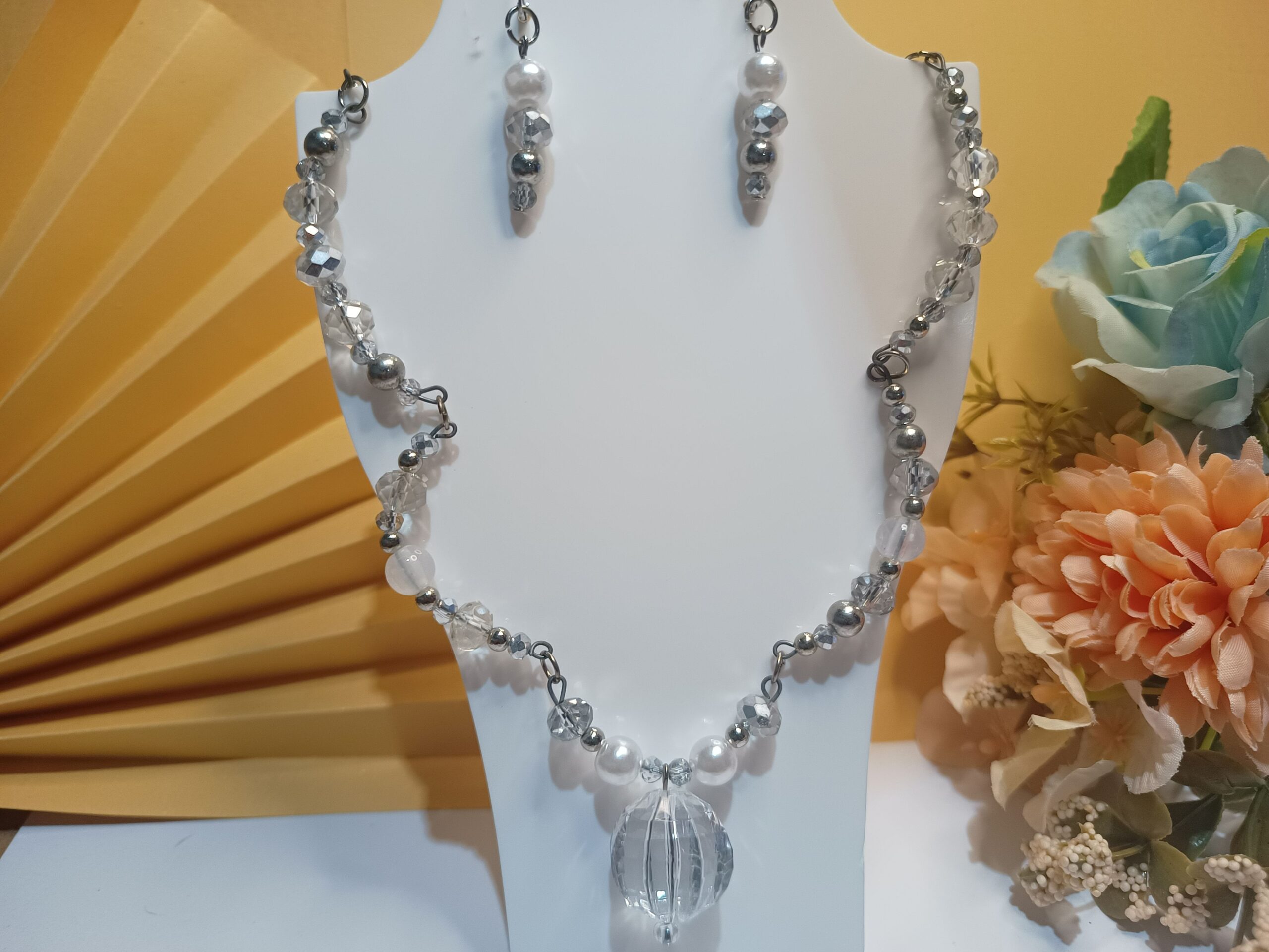 Conjunto Cristal Luxo, com 2 peças, sendo a 1ª peça Brincos em pérola, cristais prateados e contas métalicas prateadas, base de brinco argola click e a 2ª peça um colar com 45 cristais, pérolas, contas metálicas prateadas dispostos em semi argolas em arame envelhecido e pingente central em forma de esfera em forma de gomos