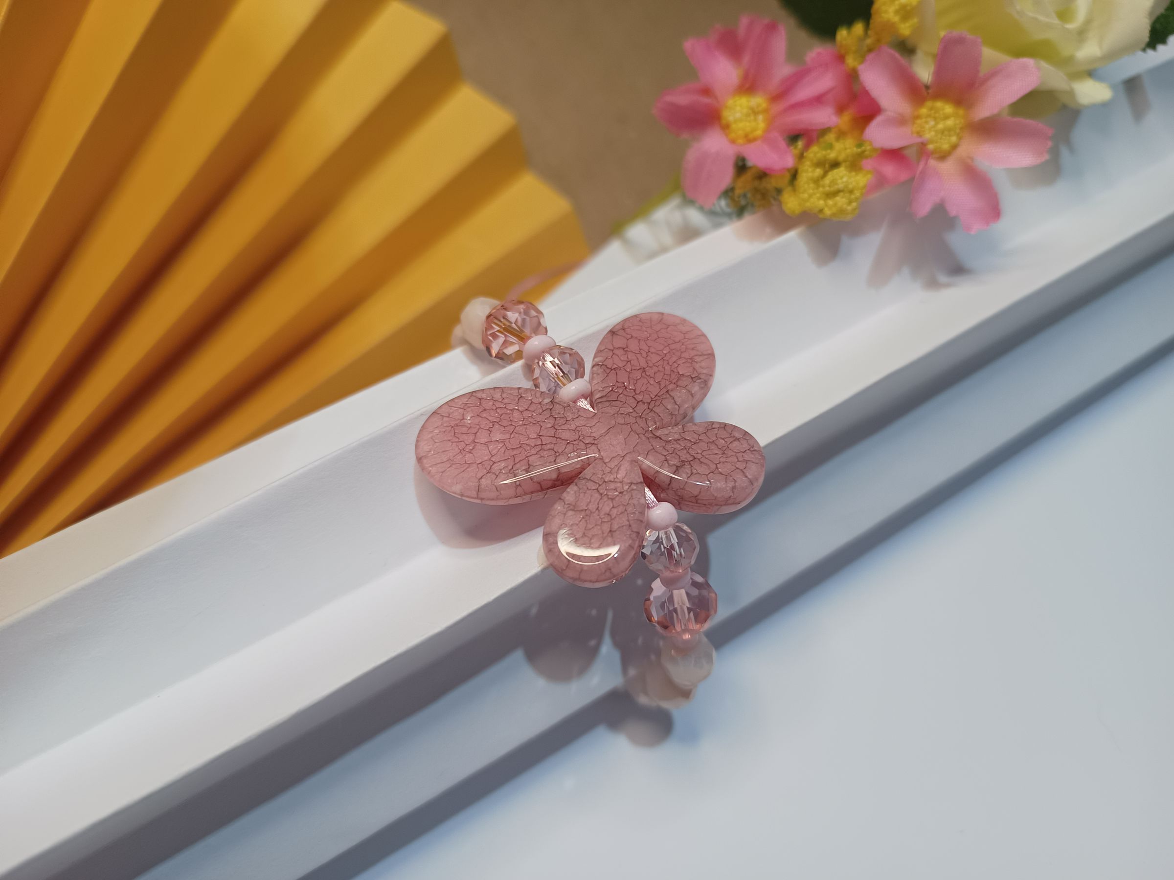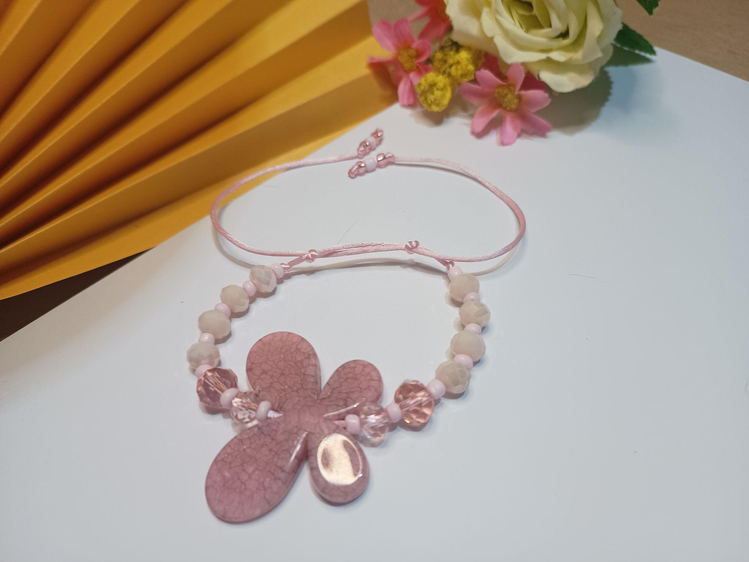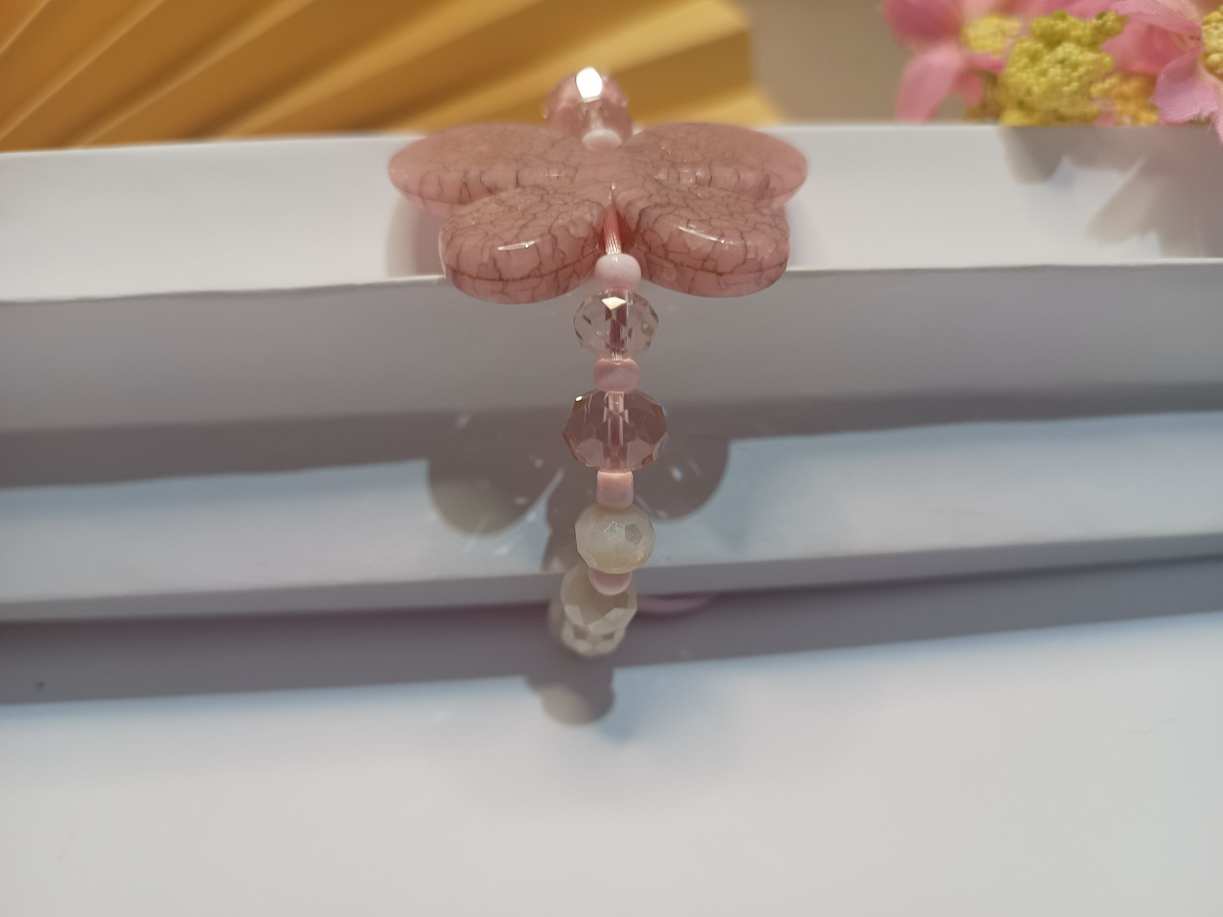 Adicione um toque de encanto ao seu visual com esta pulseira de macramê. Os cristais e miçangas rosa se combinam em uma harmonia perfeita, e a borboleta rajada é o destaque que faltava para uma joia única e estilosa.