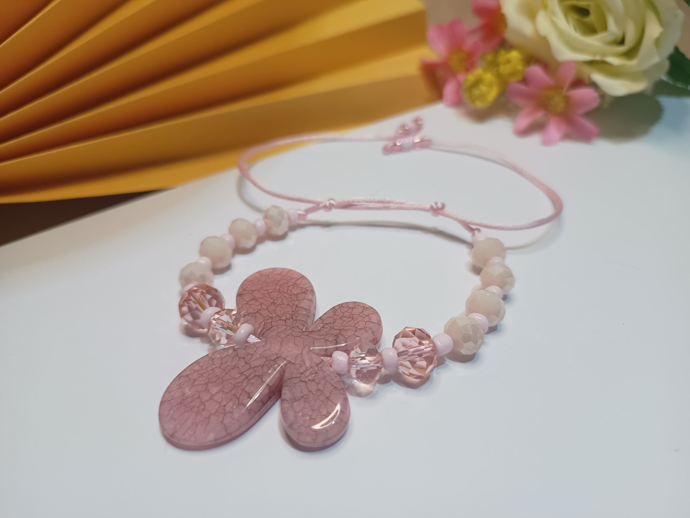 Pulseira com fio de seda rosa com cristais rosa claro translúcido e cristais na cor creme, miçangas na cor rosa claro e entremeio de borboleta resinado na cor rosa com fecho em macramê ajustável