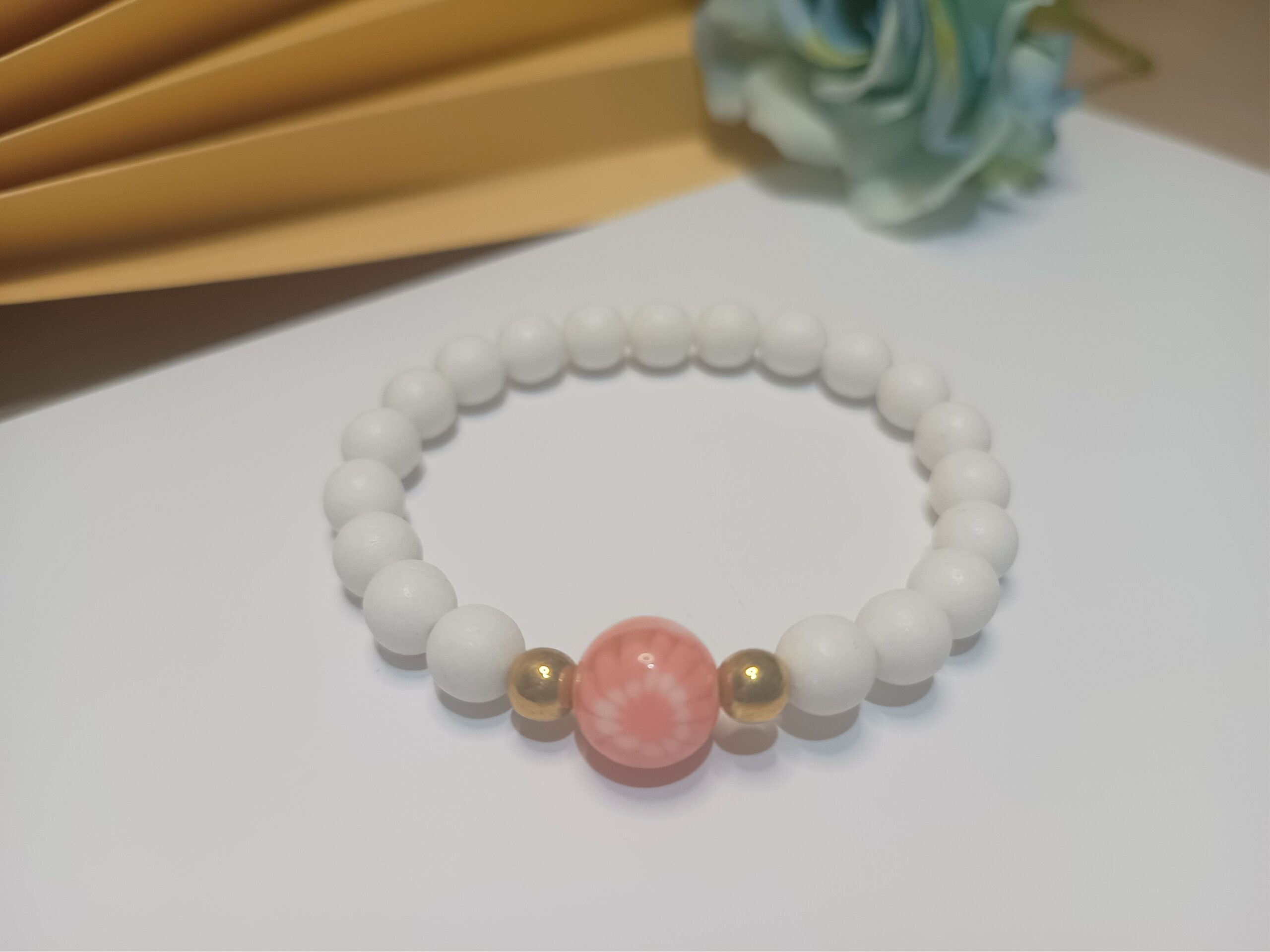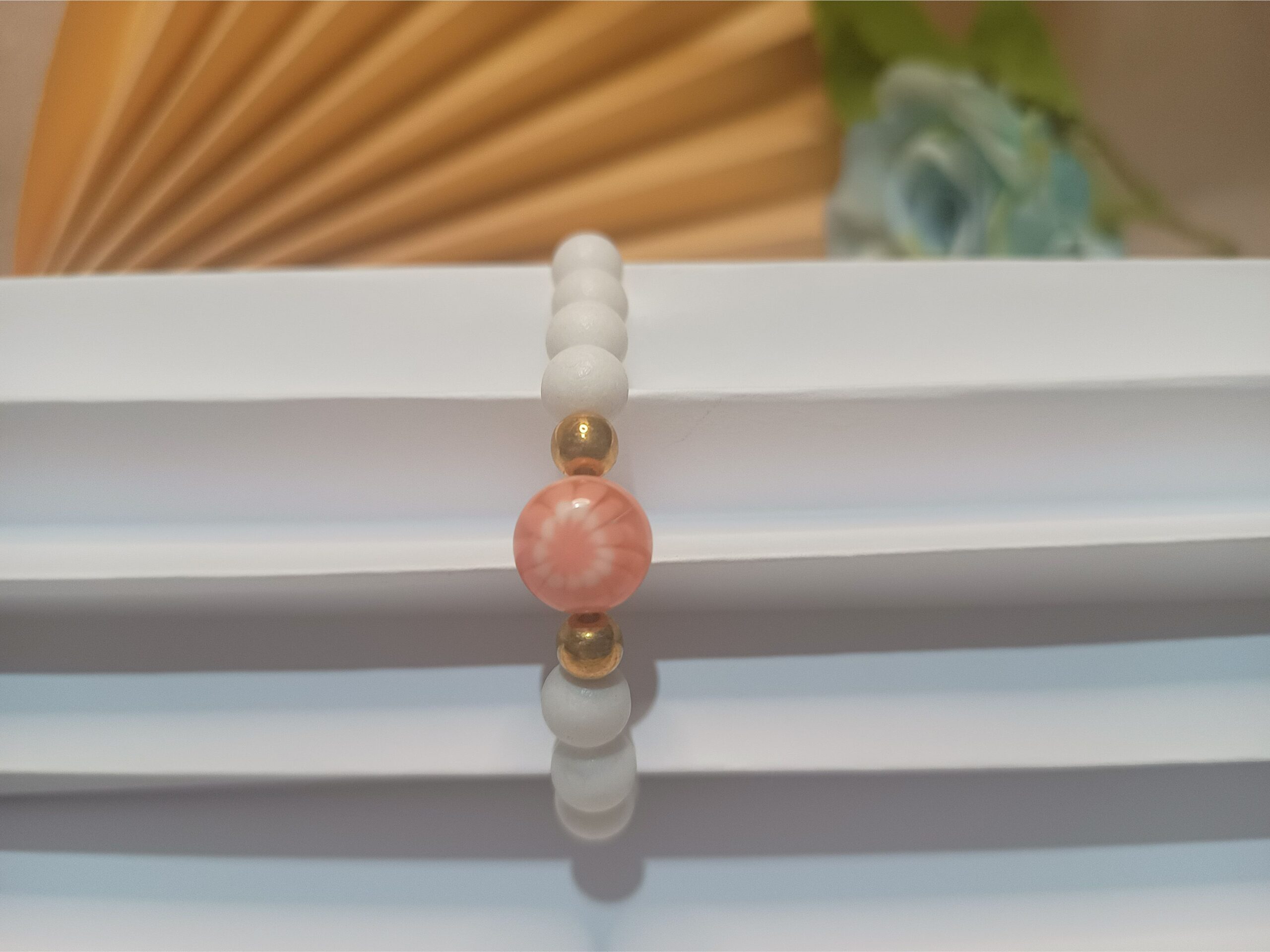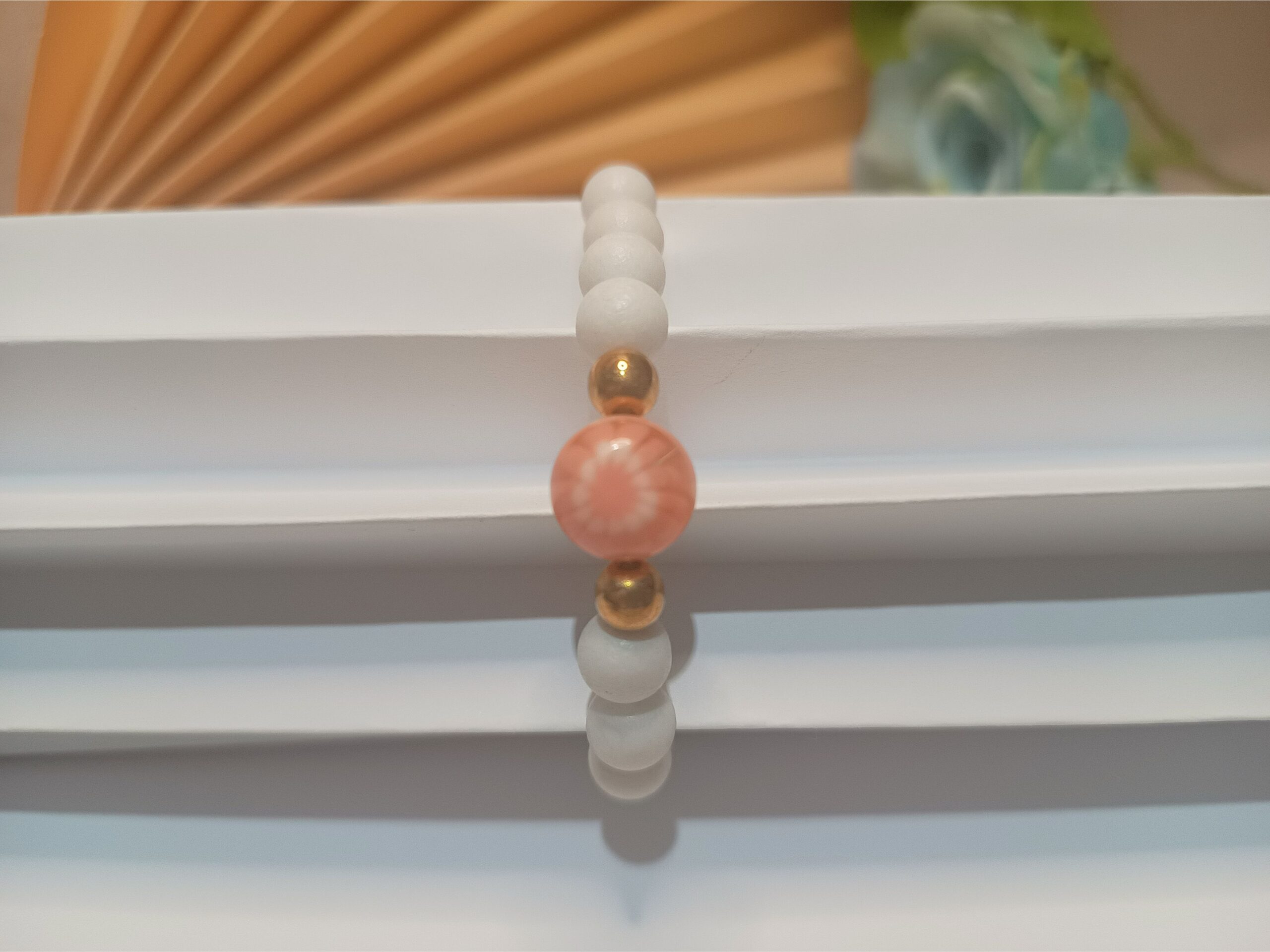 Pulseira de silicone com contas resinadas branco fosco e esfera central pessego rajado e branco