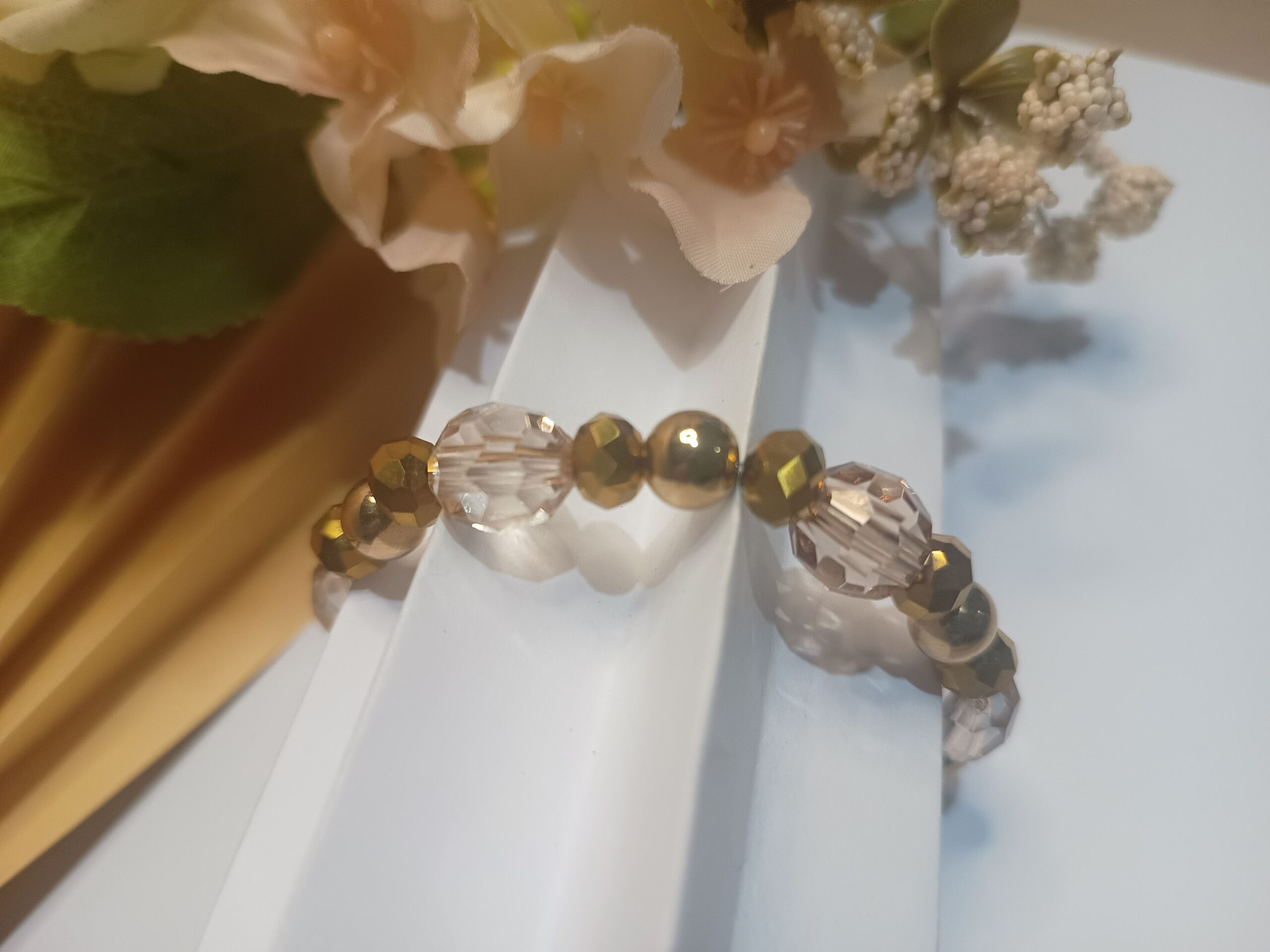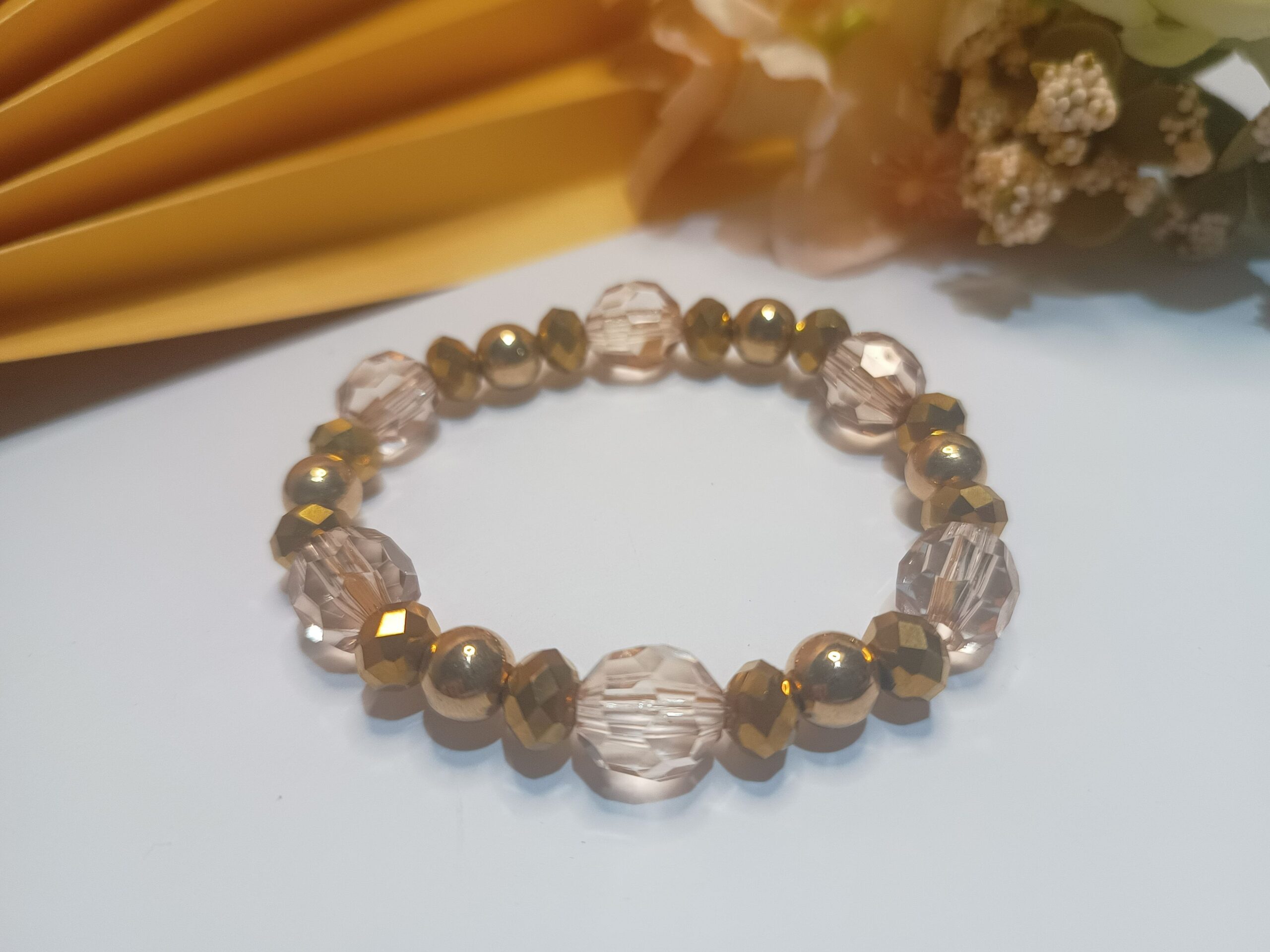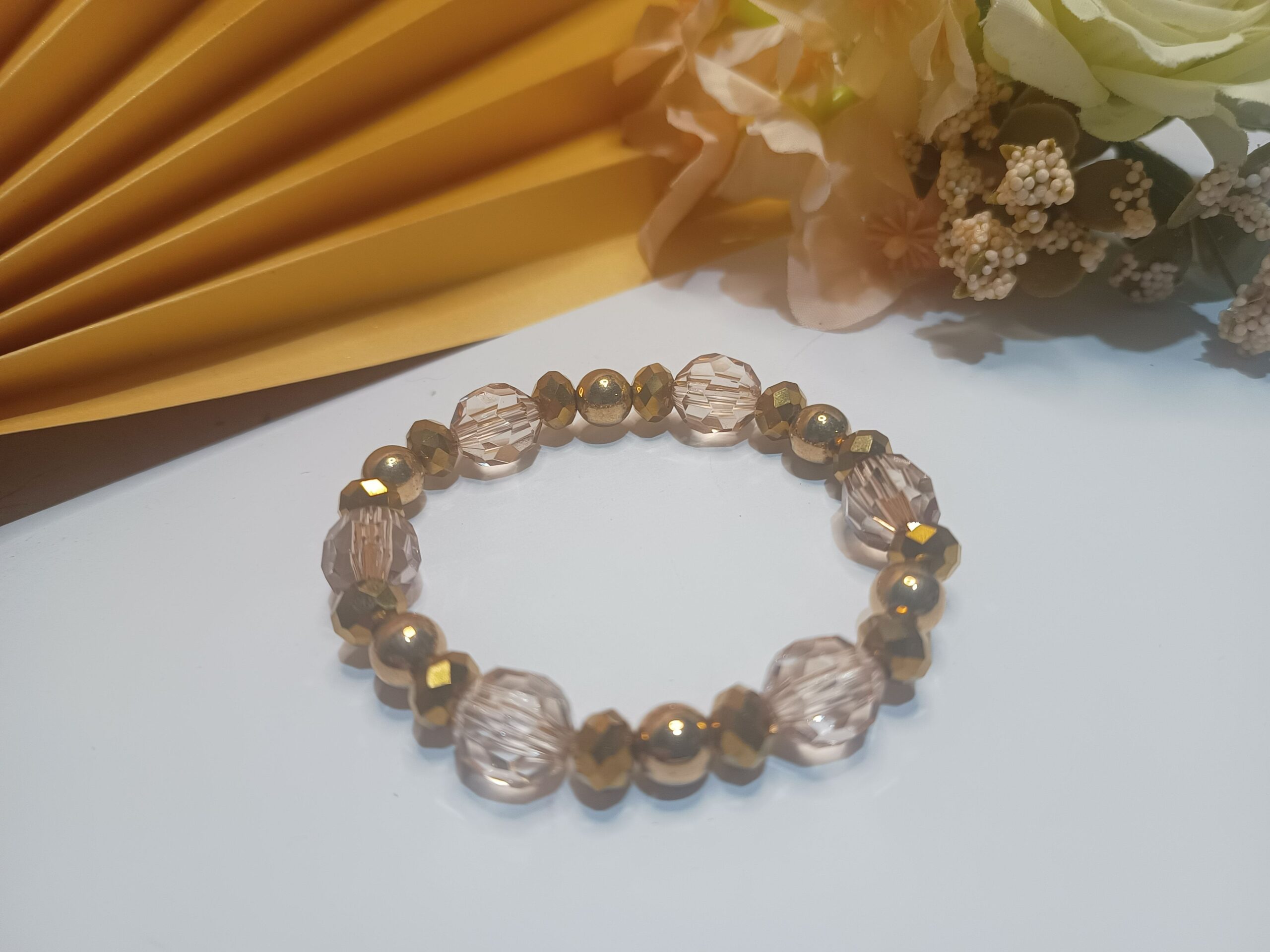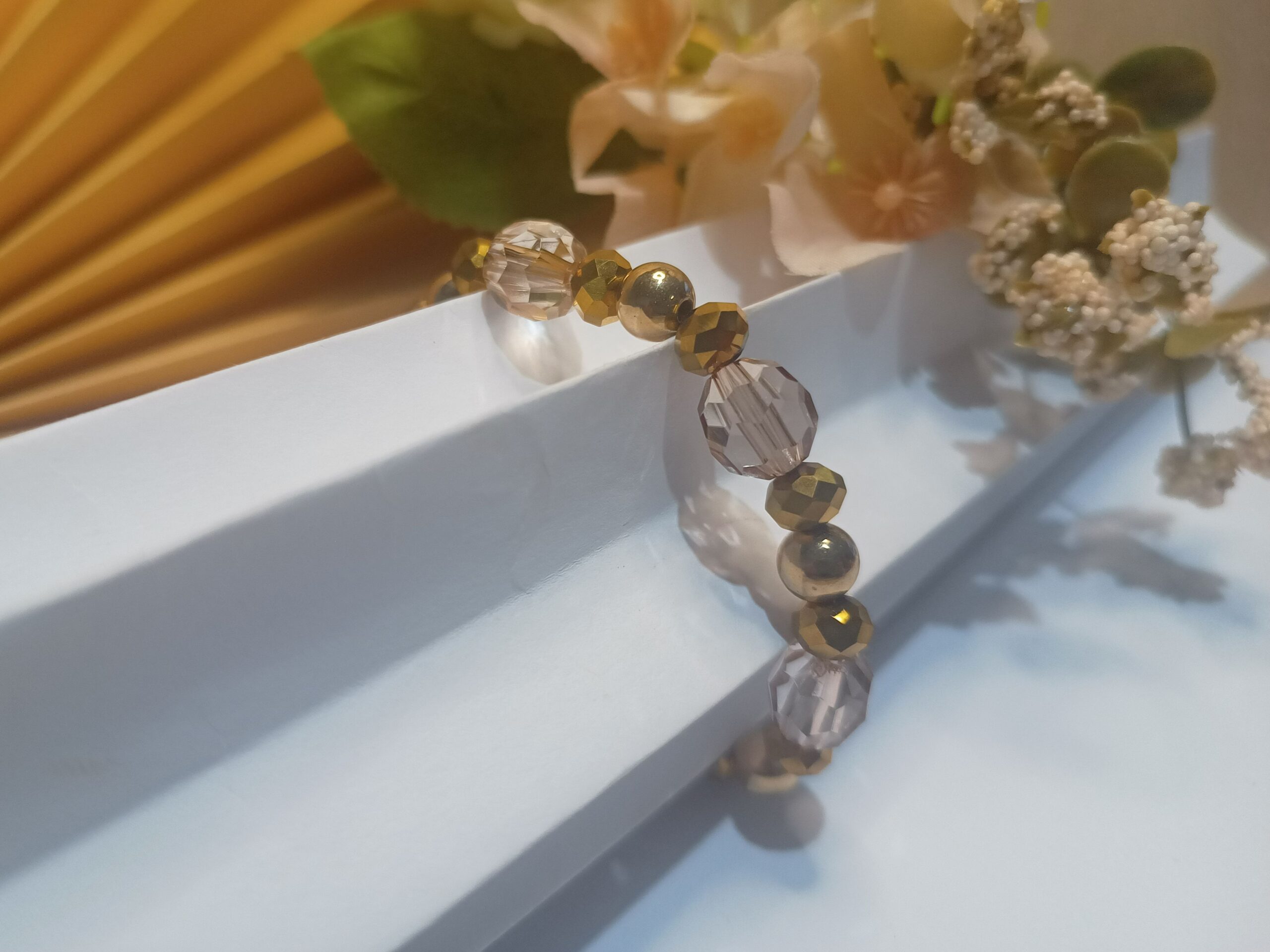 Puro brilho no seu pulso! A combinação de cristais dourados e contas marrom translúcido nesta pulseira de silicone é a escolha perfeita para quem quer um toque de elegância e glamour.