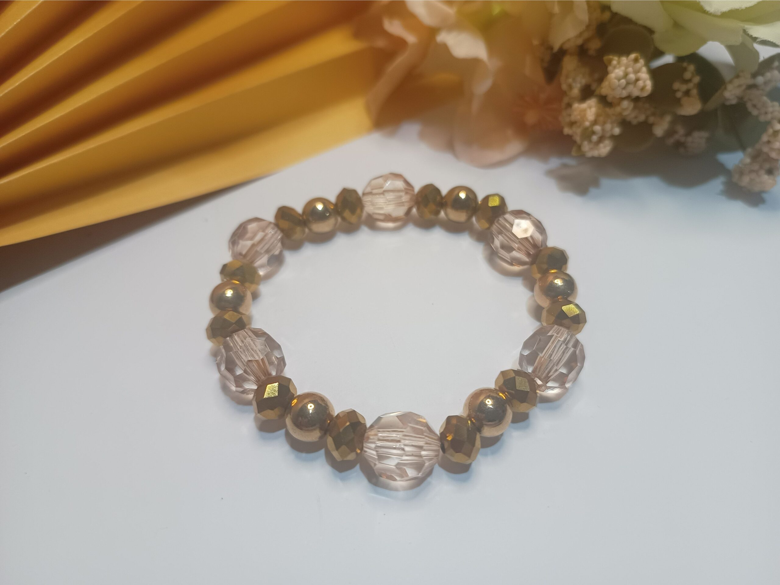 Pulseira de silicone com cristais sextavados dourados, contas na cor marrom translúcido e contas metálicas douradas