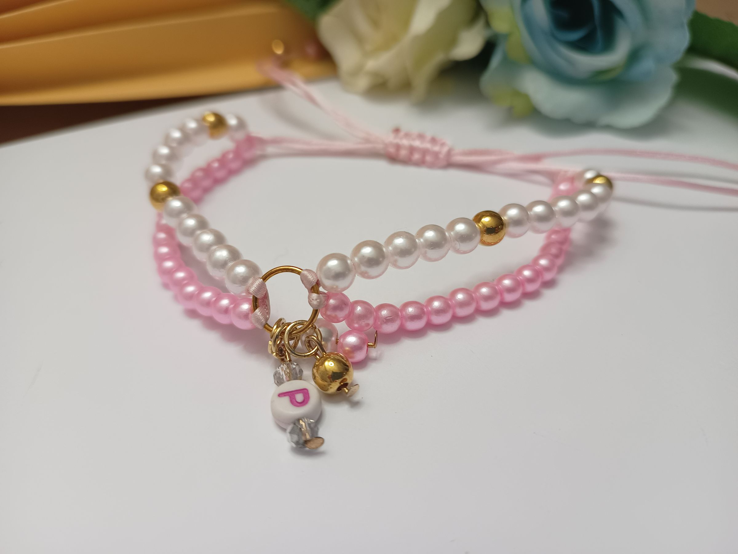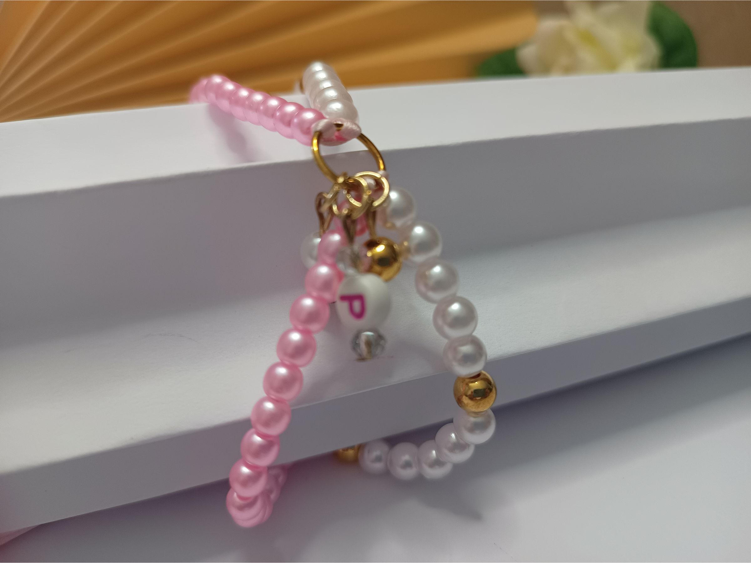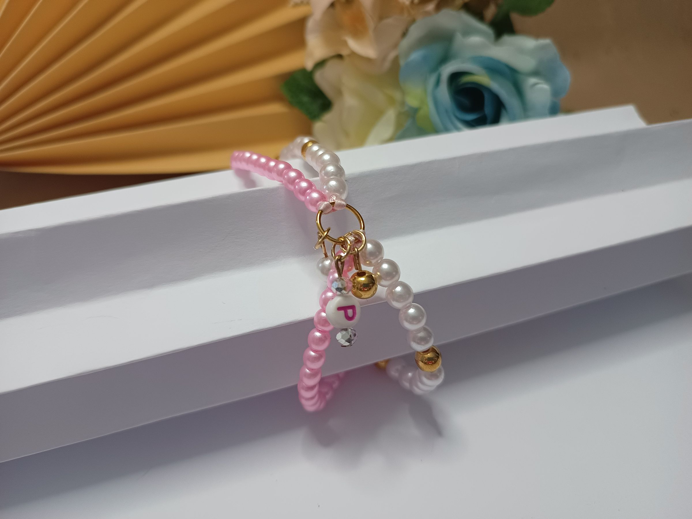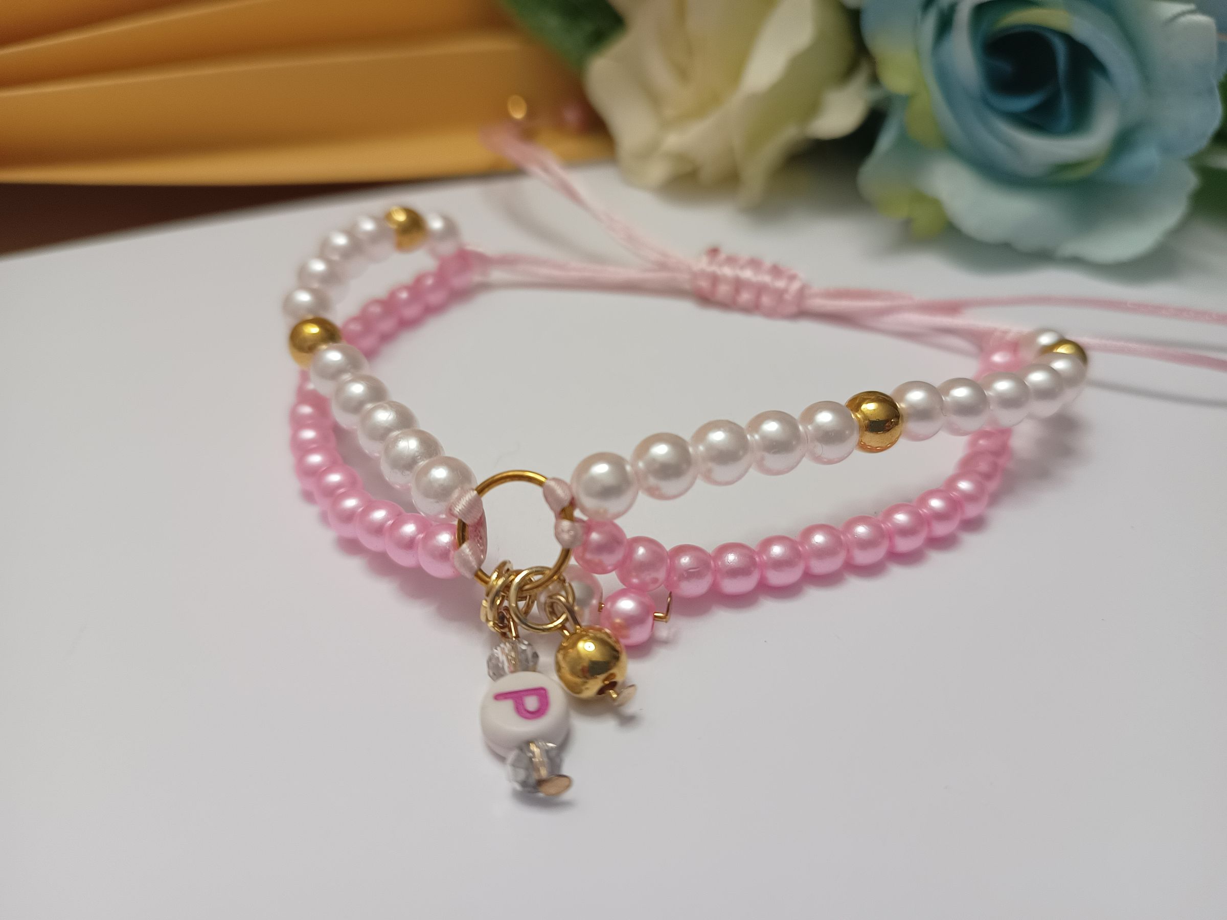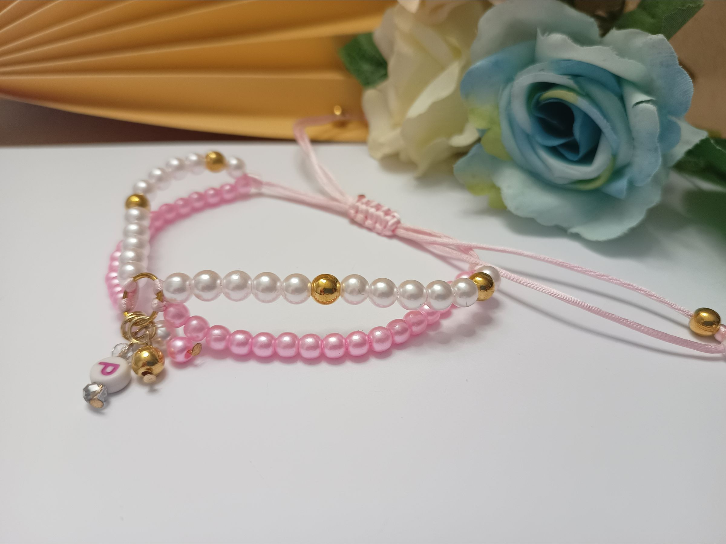 Pulseira dupla com entremeio argola e letra personalizável, contas metálicas douradas, pequenos cristais, pérolas na cora branca e rosa com fecho em macramê ajustável