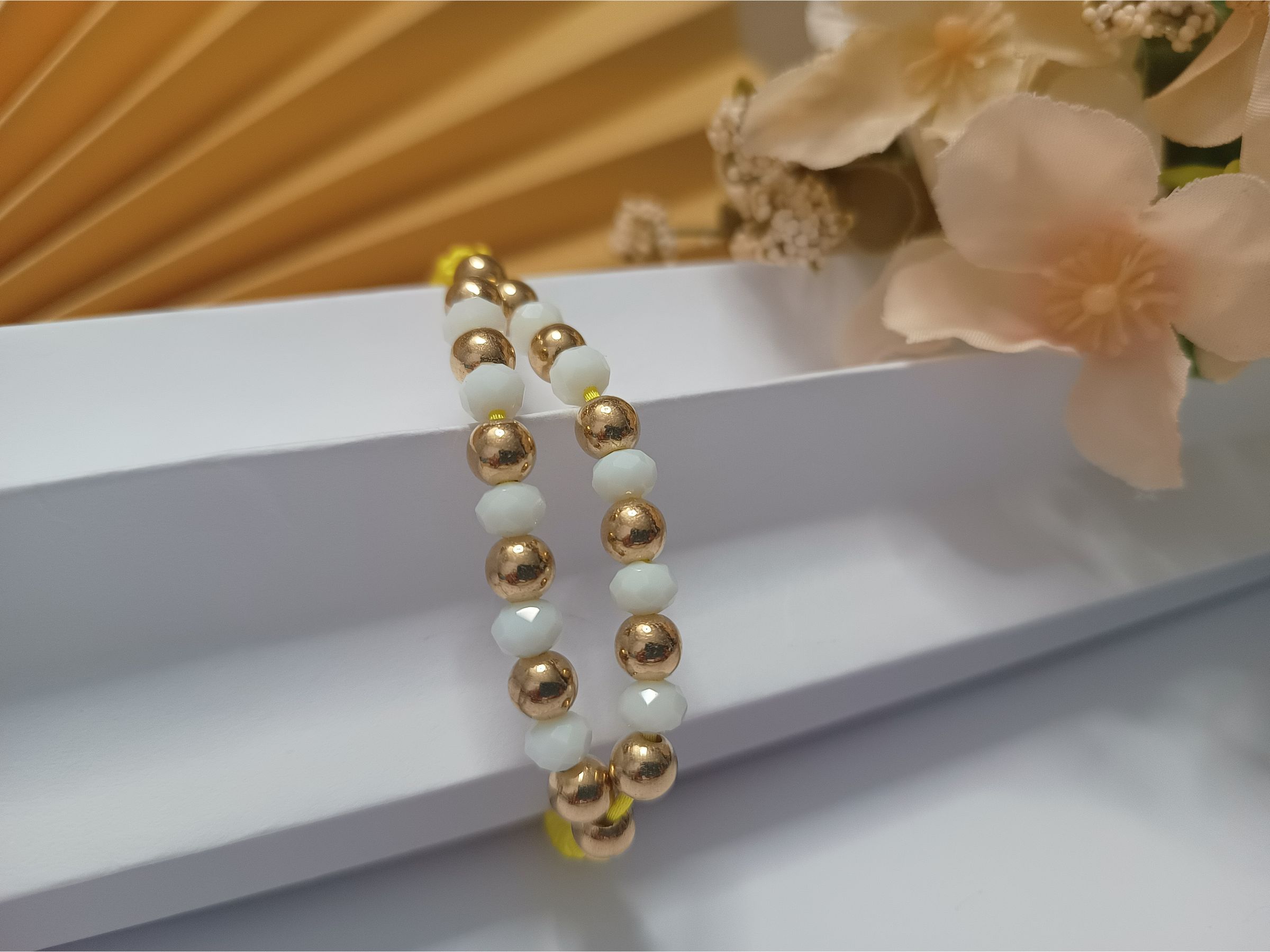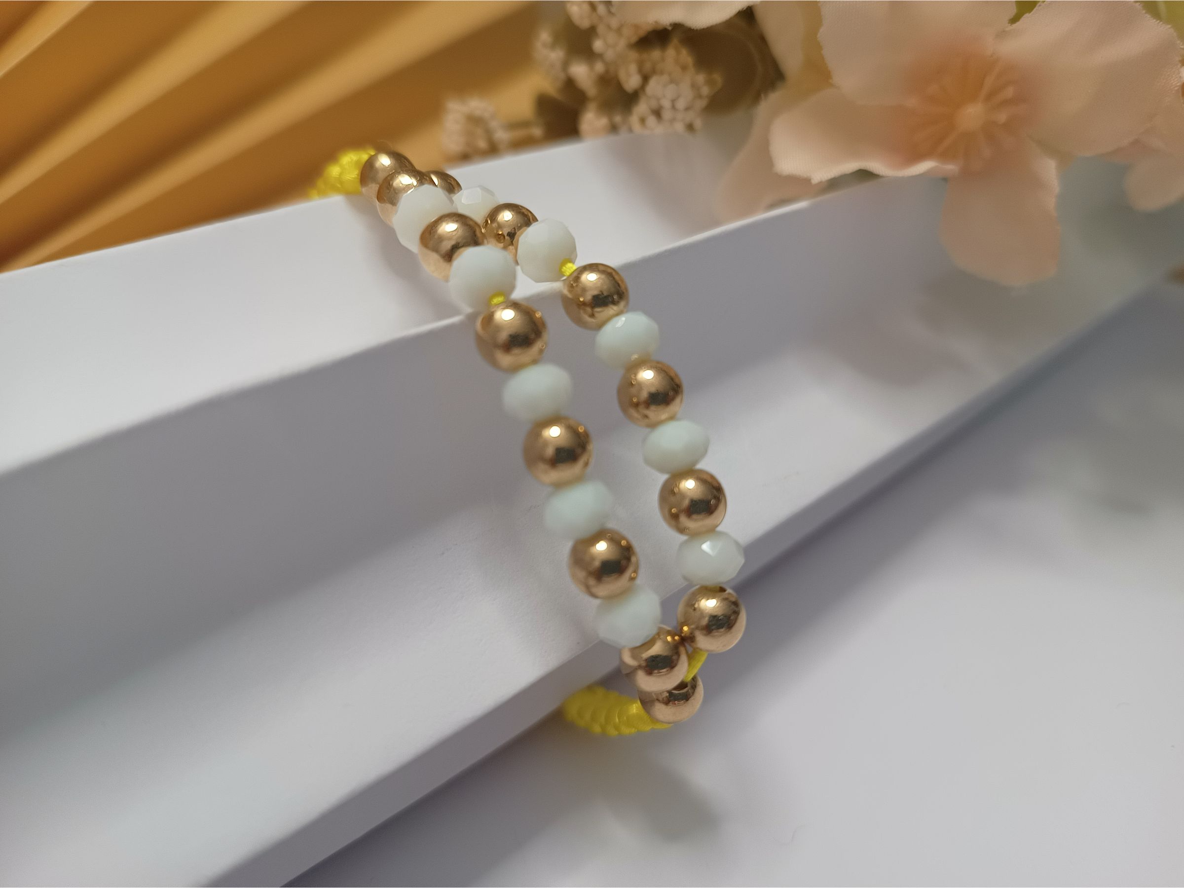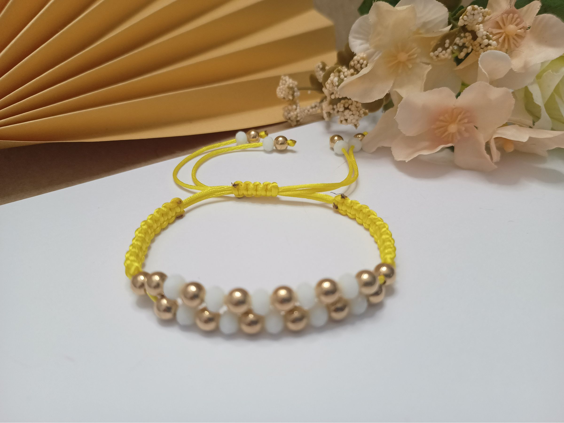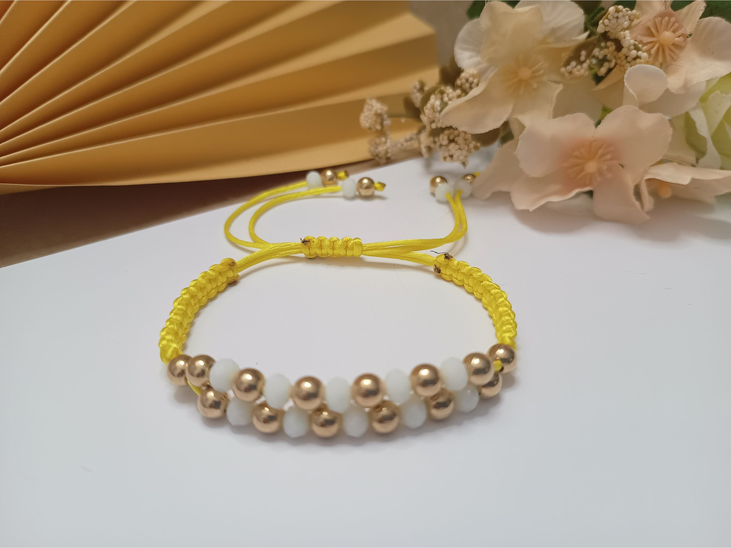 Pulseira em macramê amarela com detalhe em zigue zague de contas metálicas douradas e cristais na cor branca e fecho ajustável