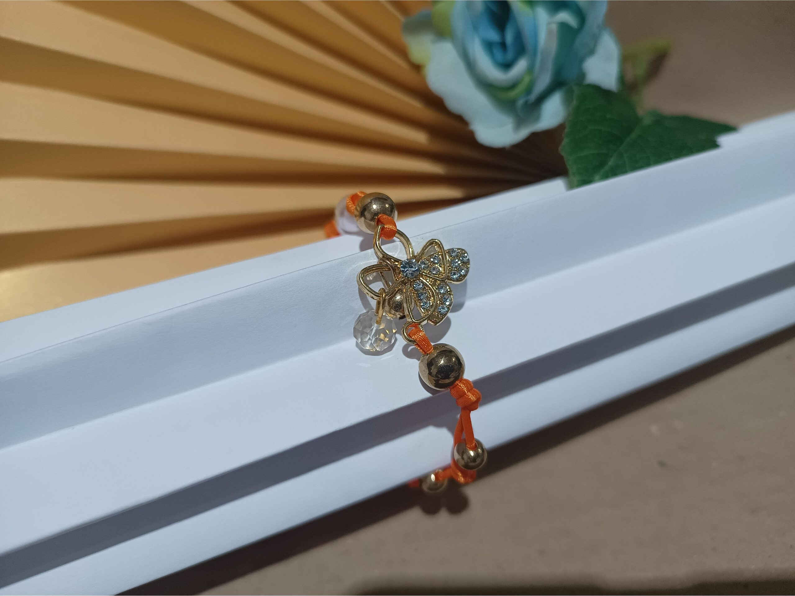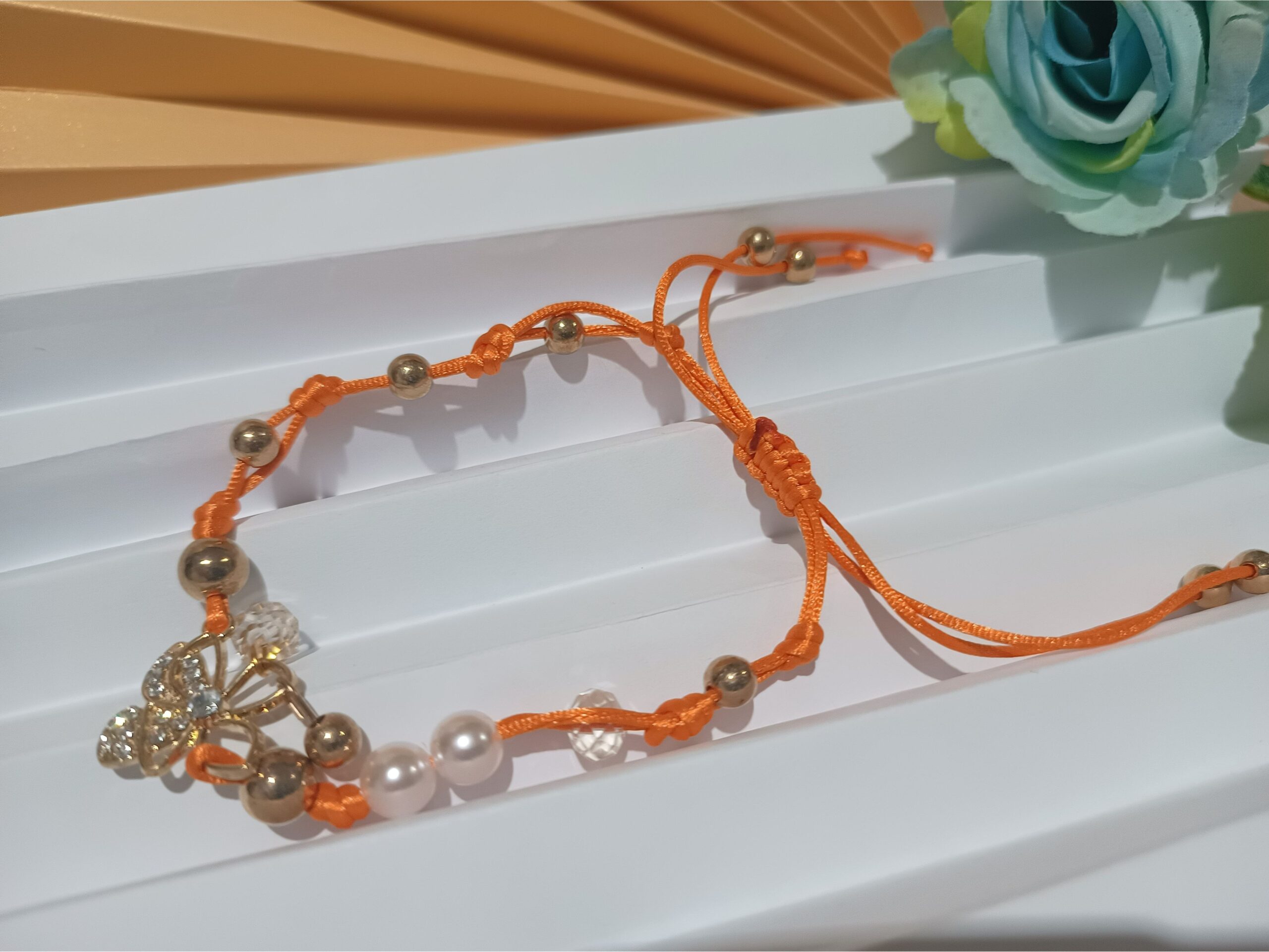 Pulseira em macramê fio coral com pingente de borboleta com strass, cristais dourados e contas metálicas douradas