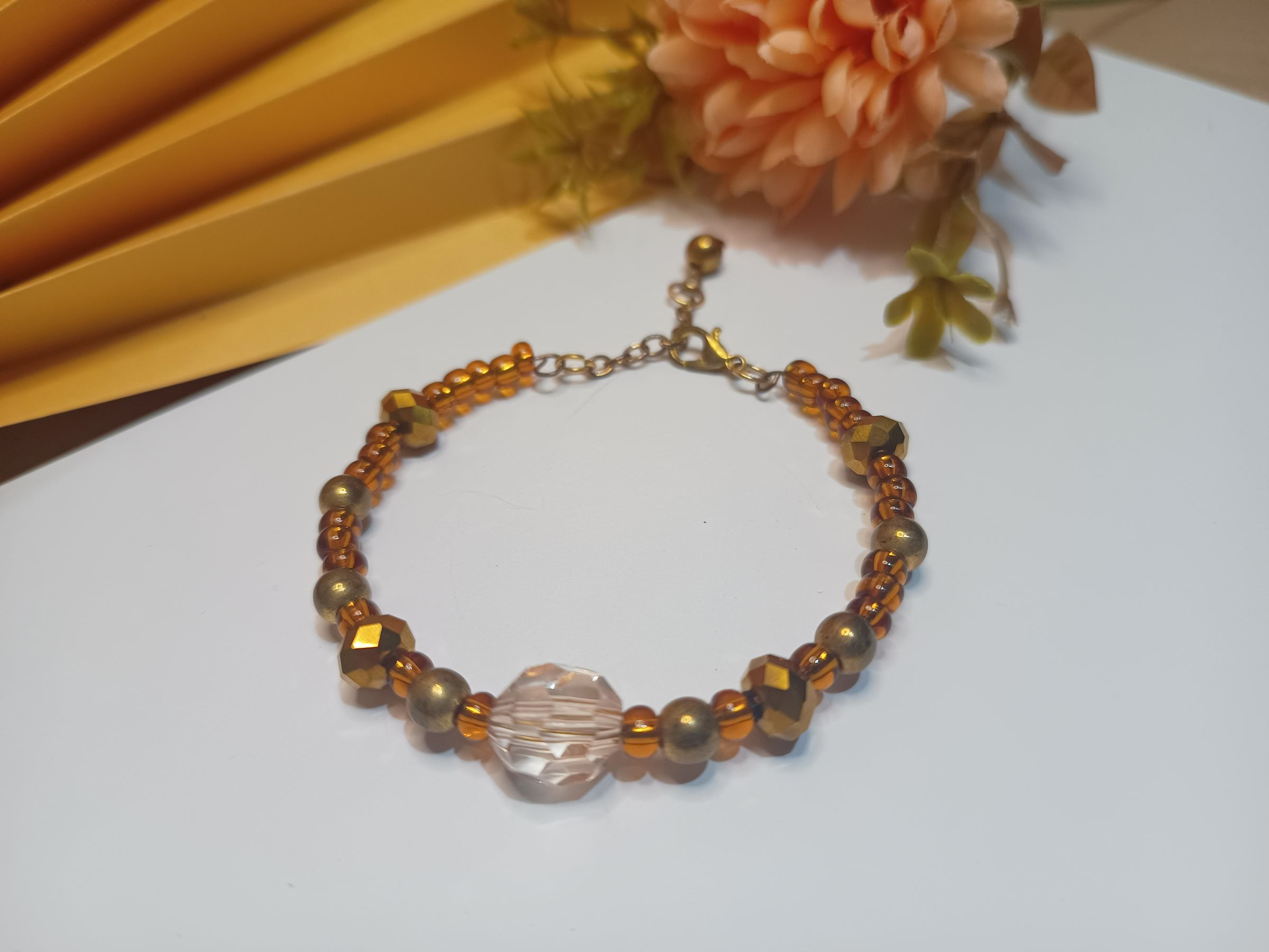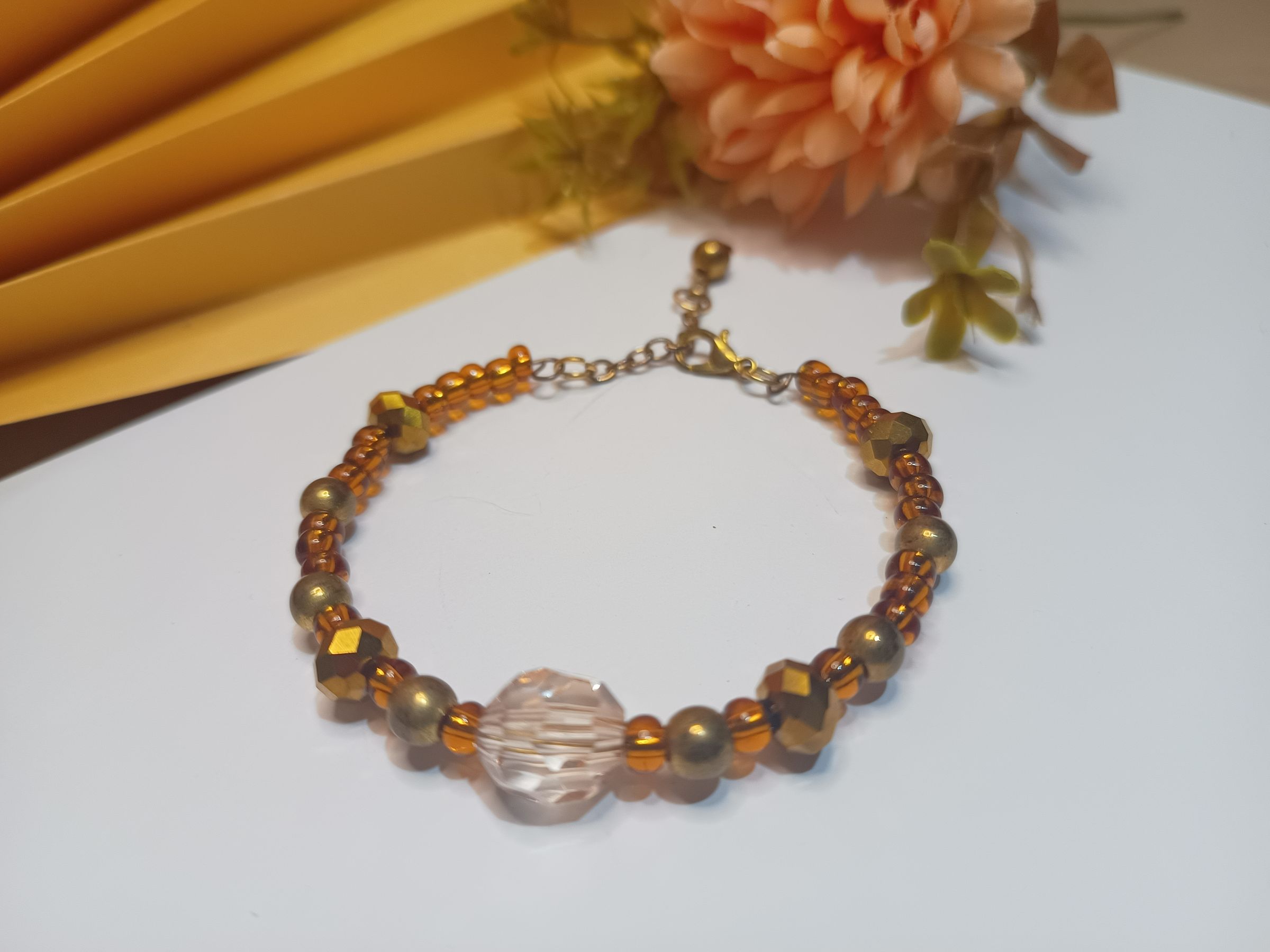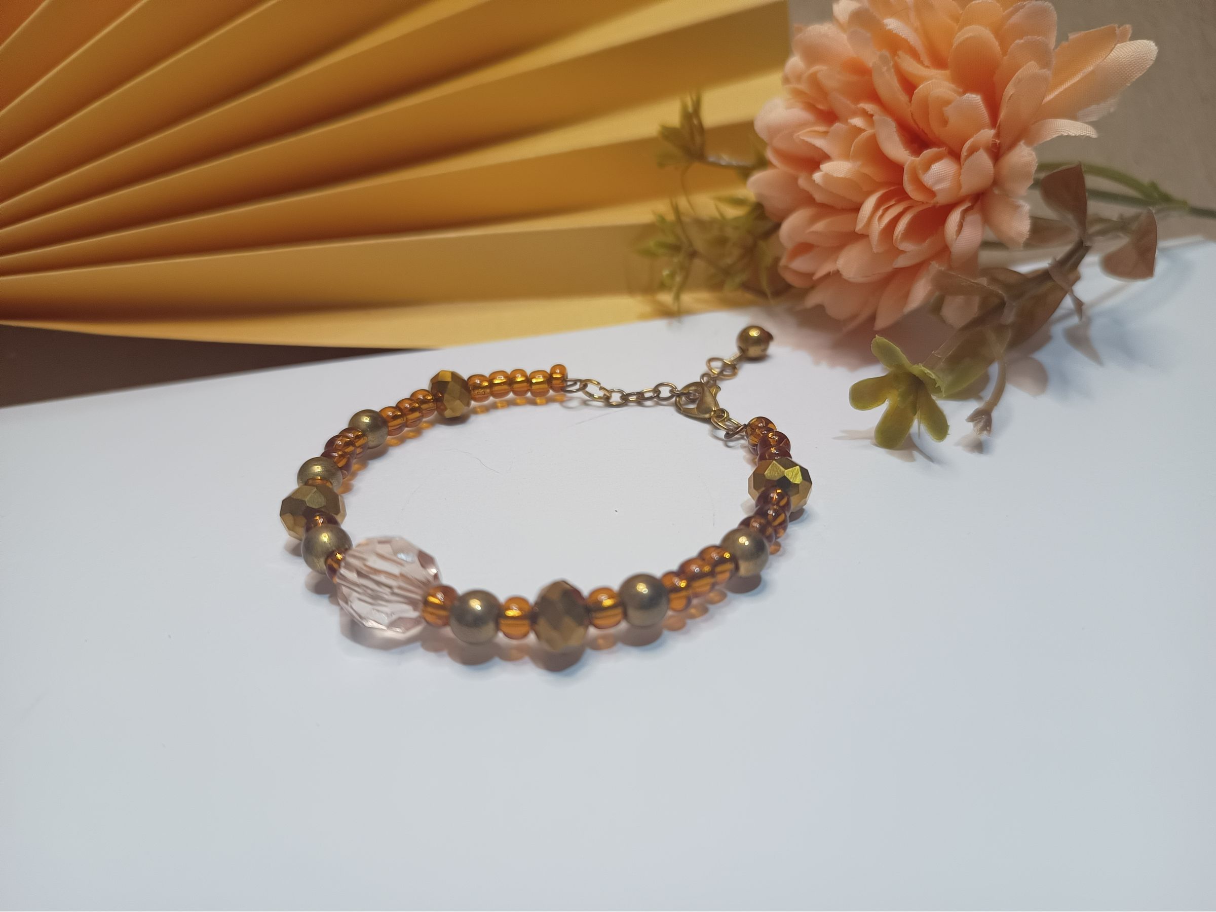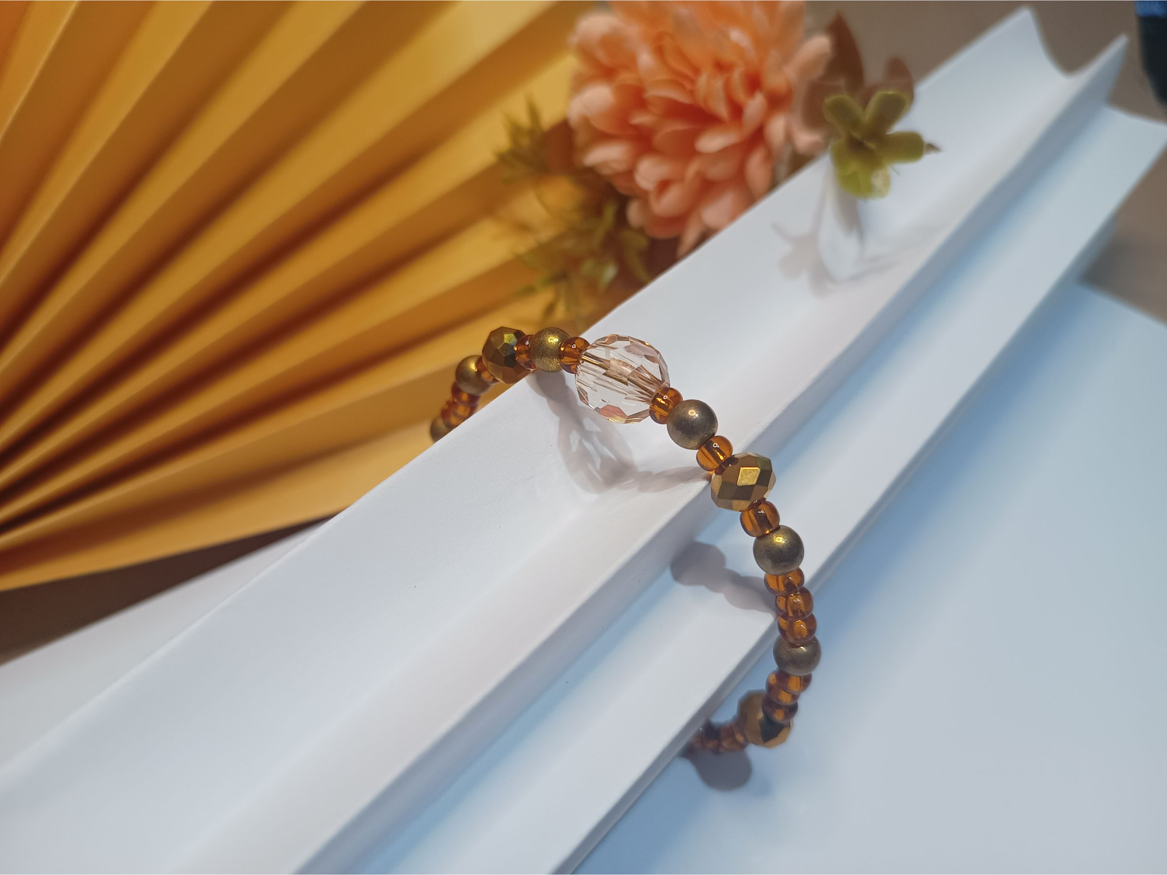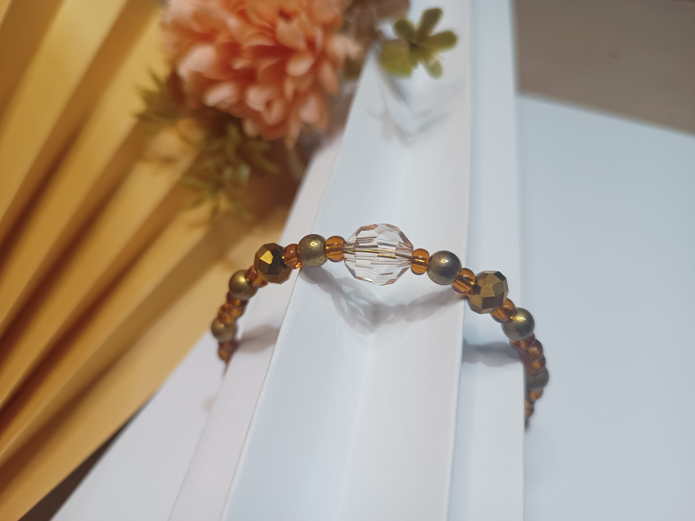 Um mix de brilho e mistério! Com cristais dourados, ouro velho e miçangas marrons, esta pulseira é única e cheia de estilo.