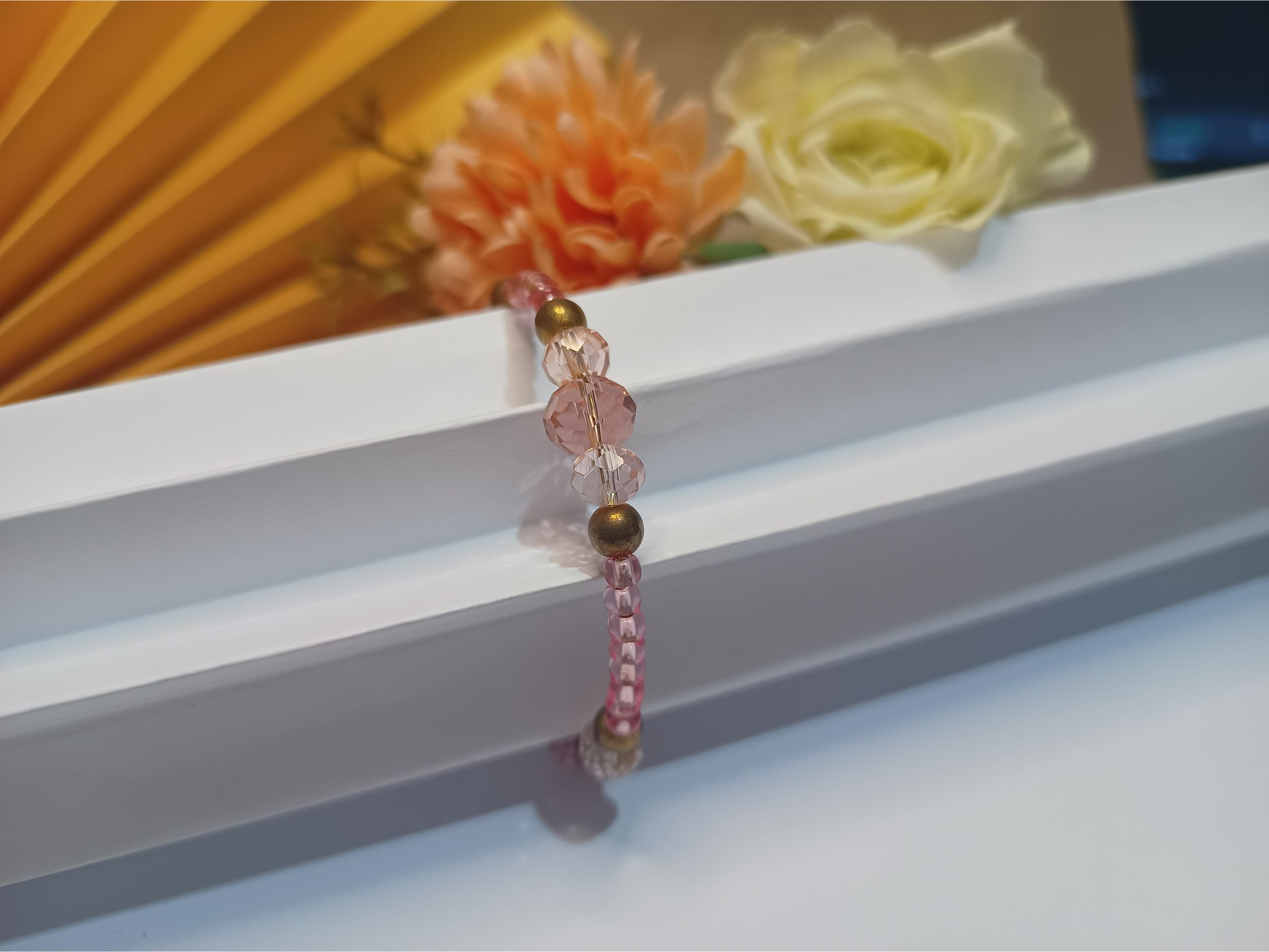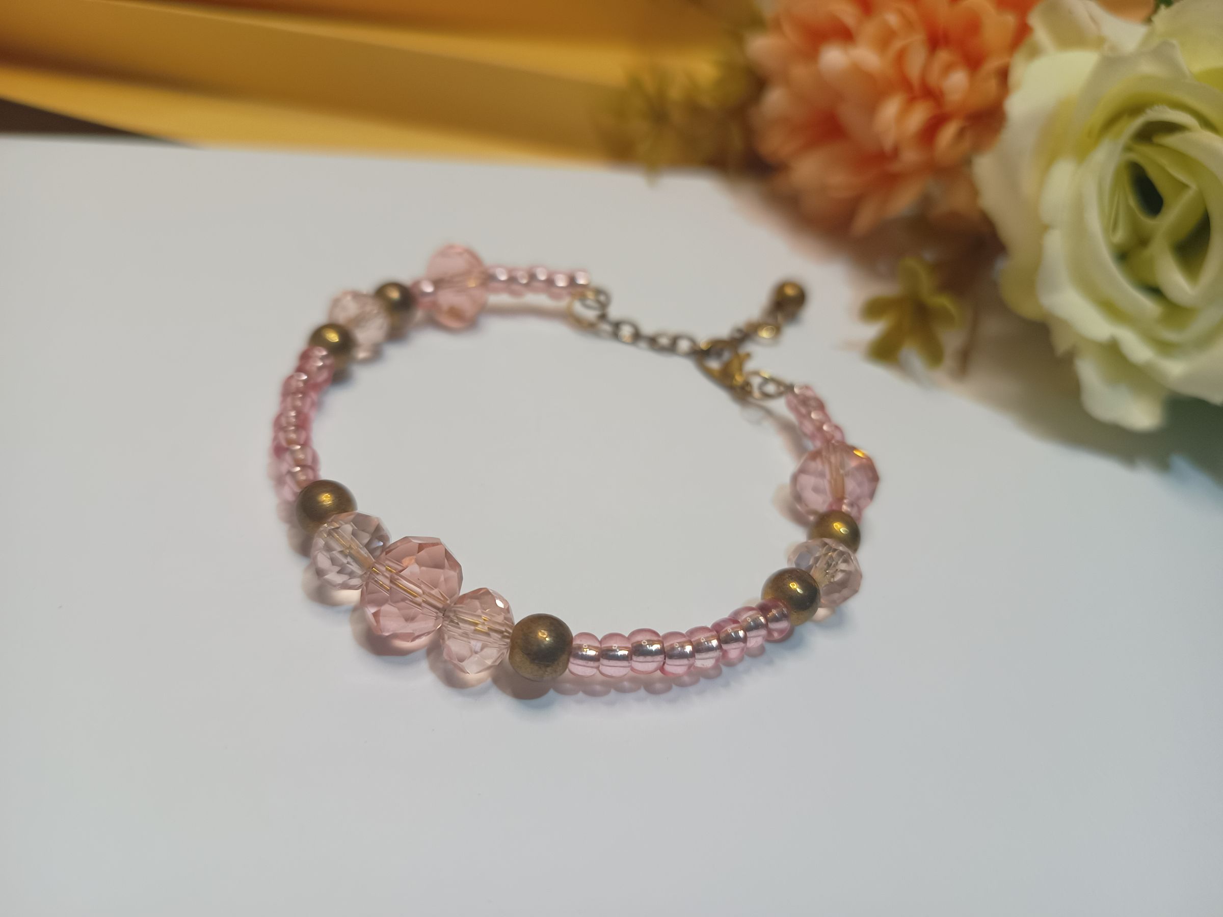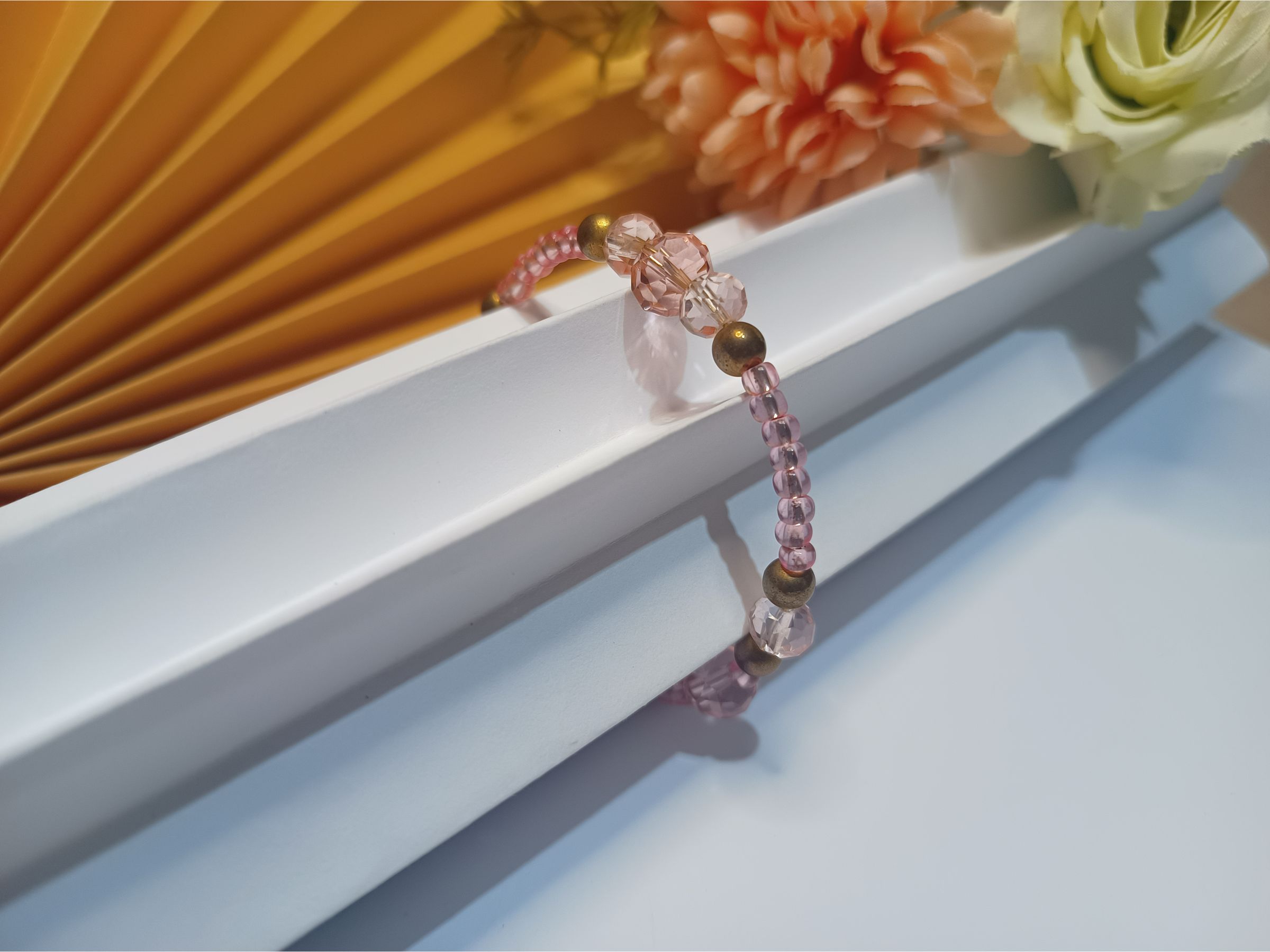 Deixe o seu lado romântico brilhar com esta pulseira adorável! Cristais rosa claro e toques de ouro velho criam um visual super charmoso.