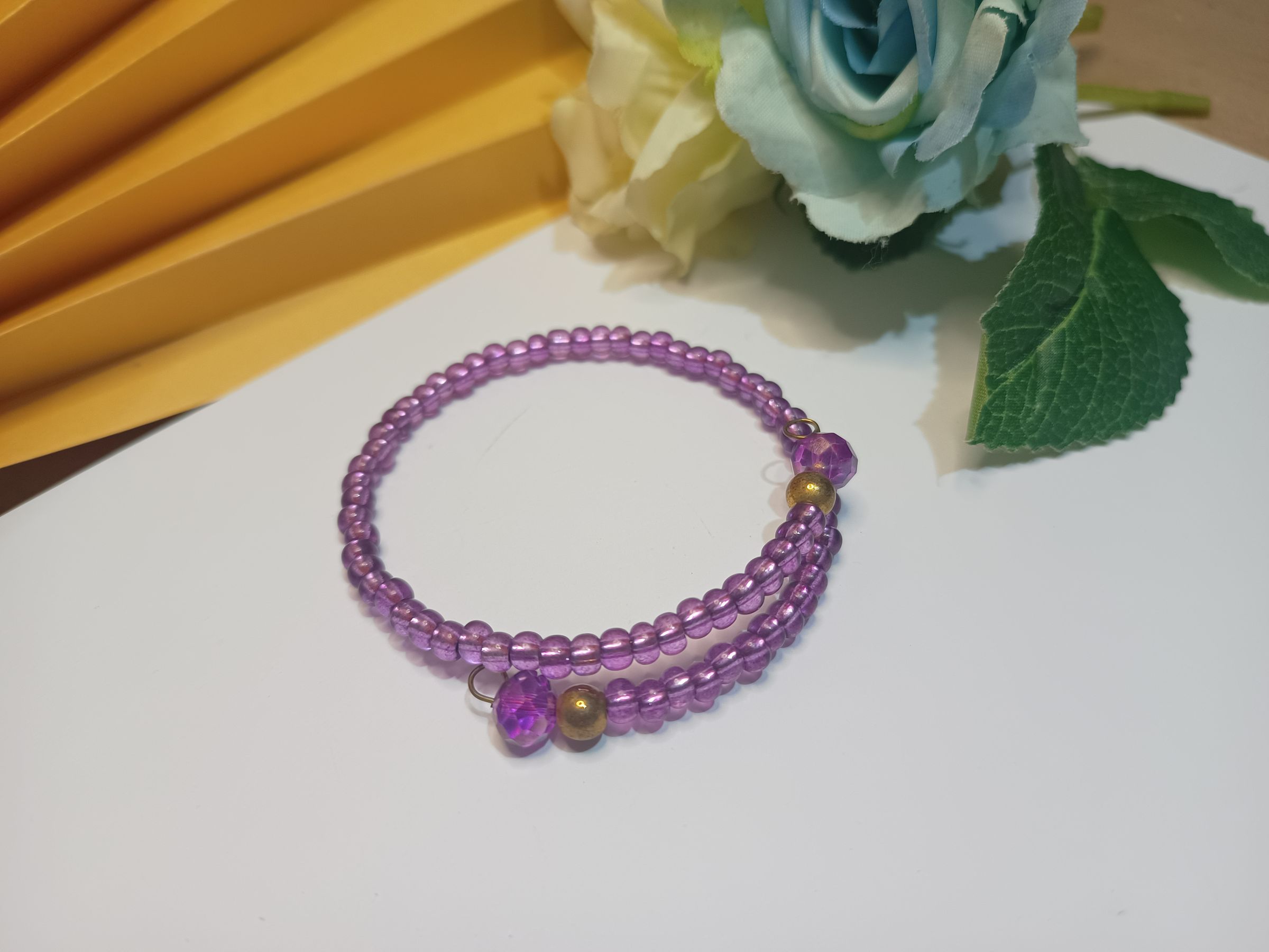 Pulseira mola de arame com cristais e miçangas rosa claro e contas metálicas ouro velho e miçangas rosa claro
