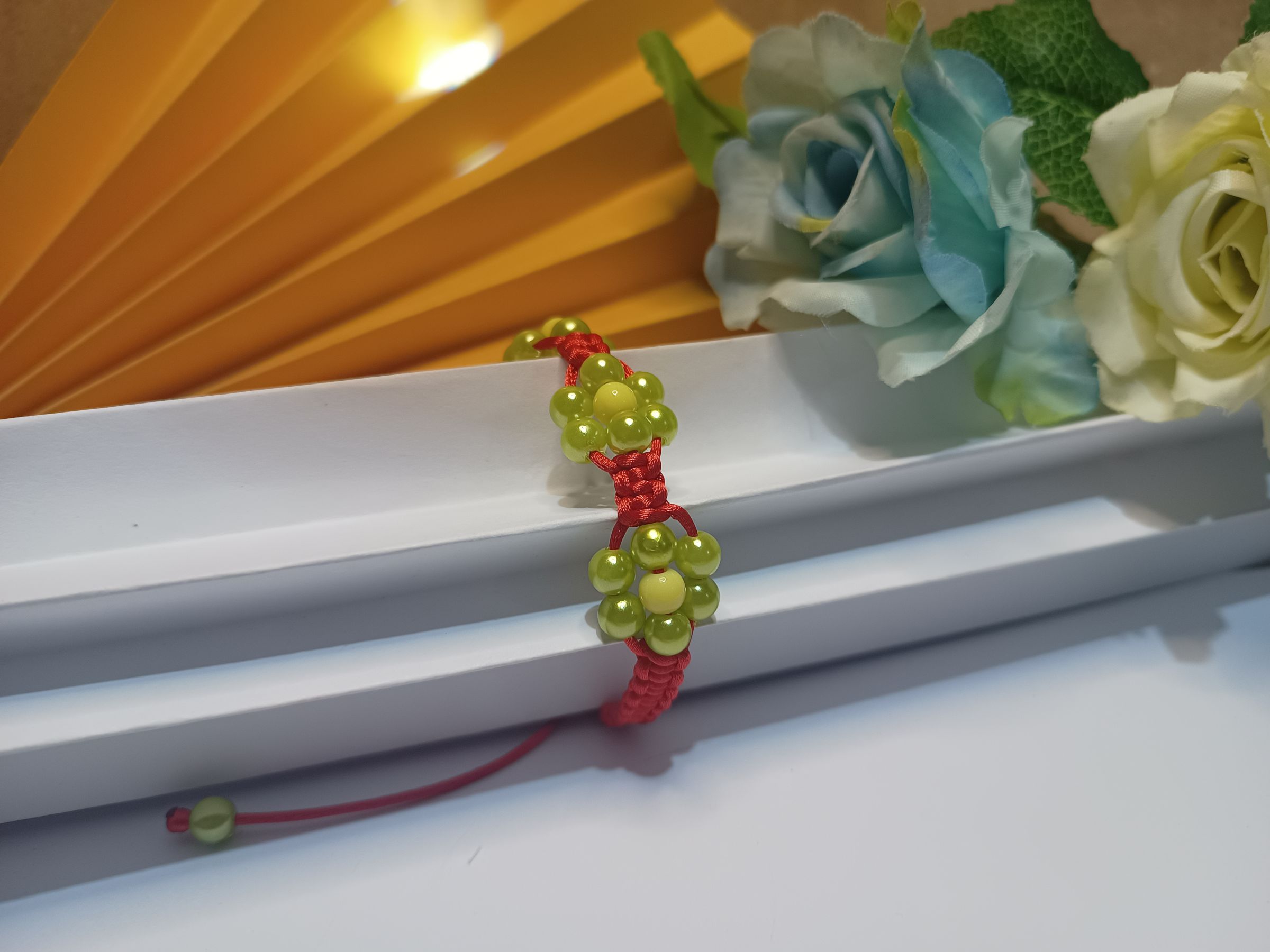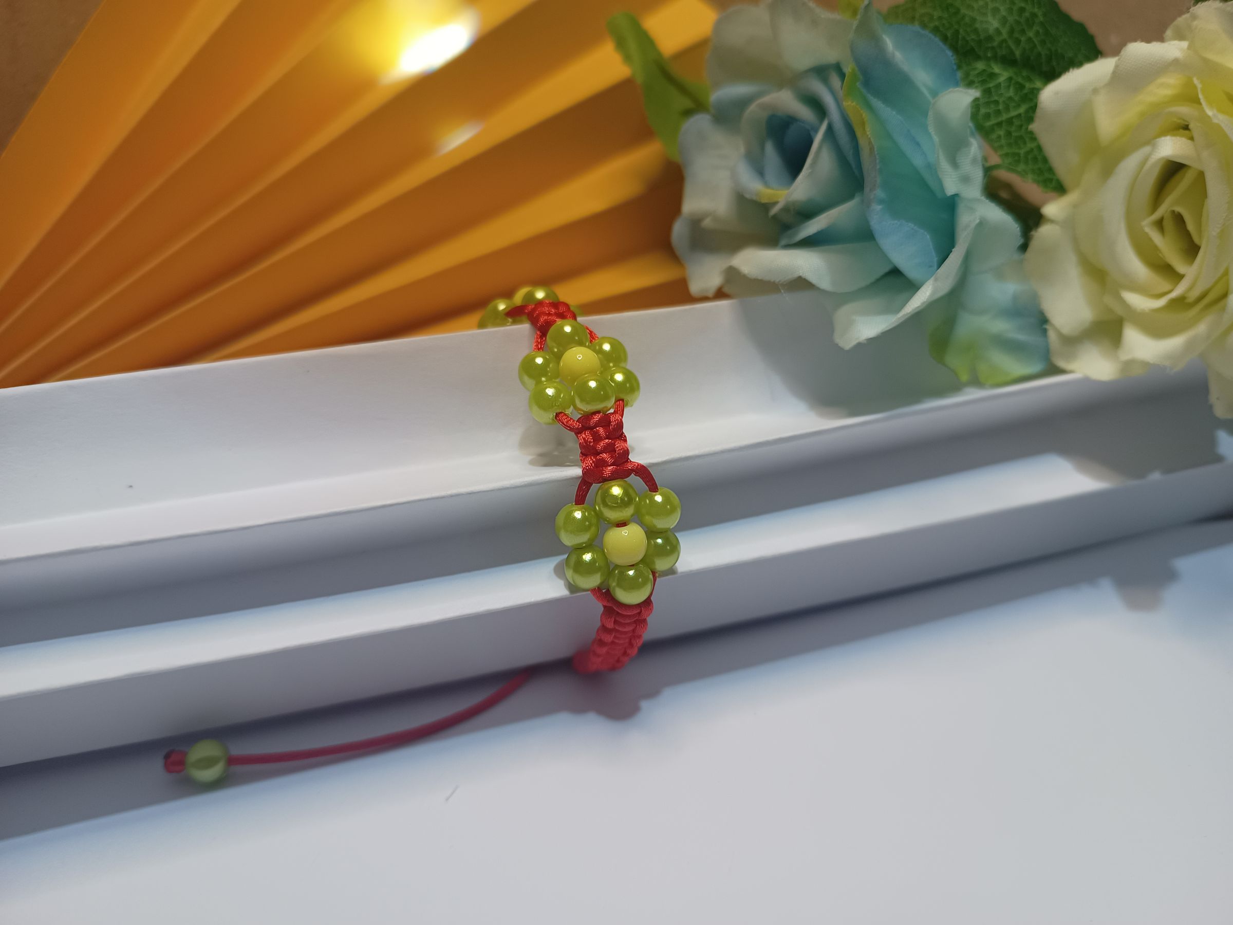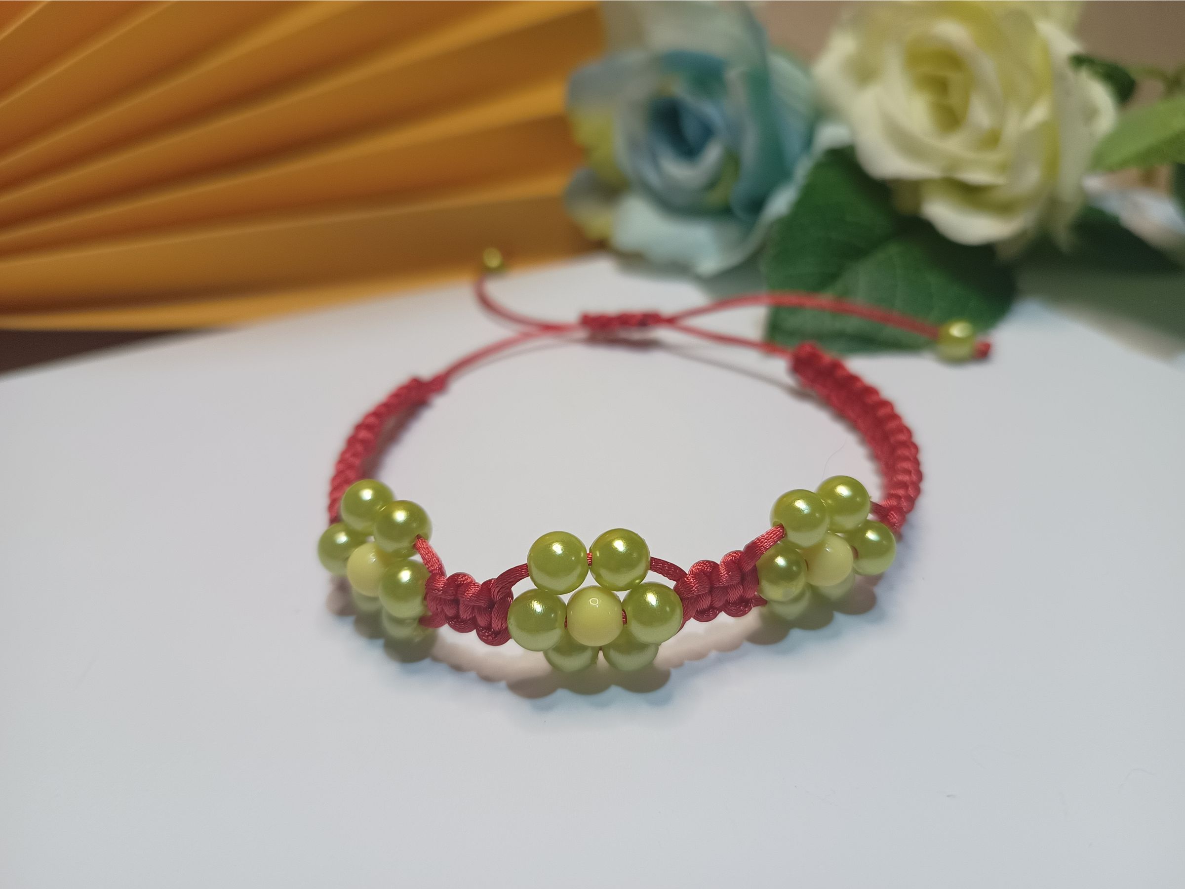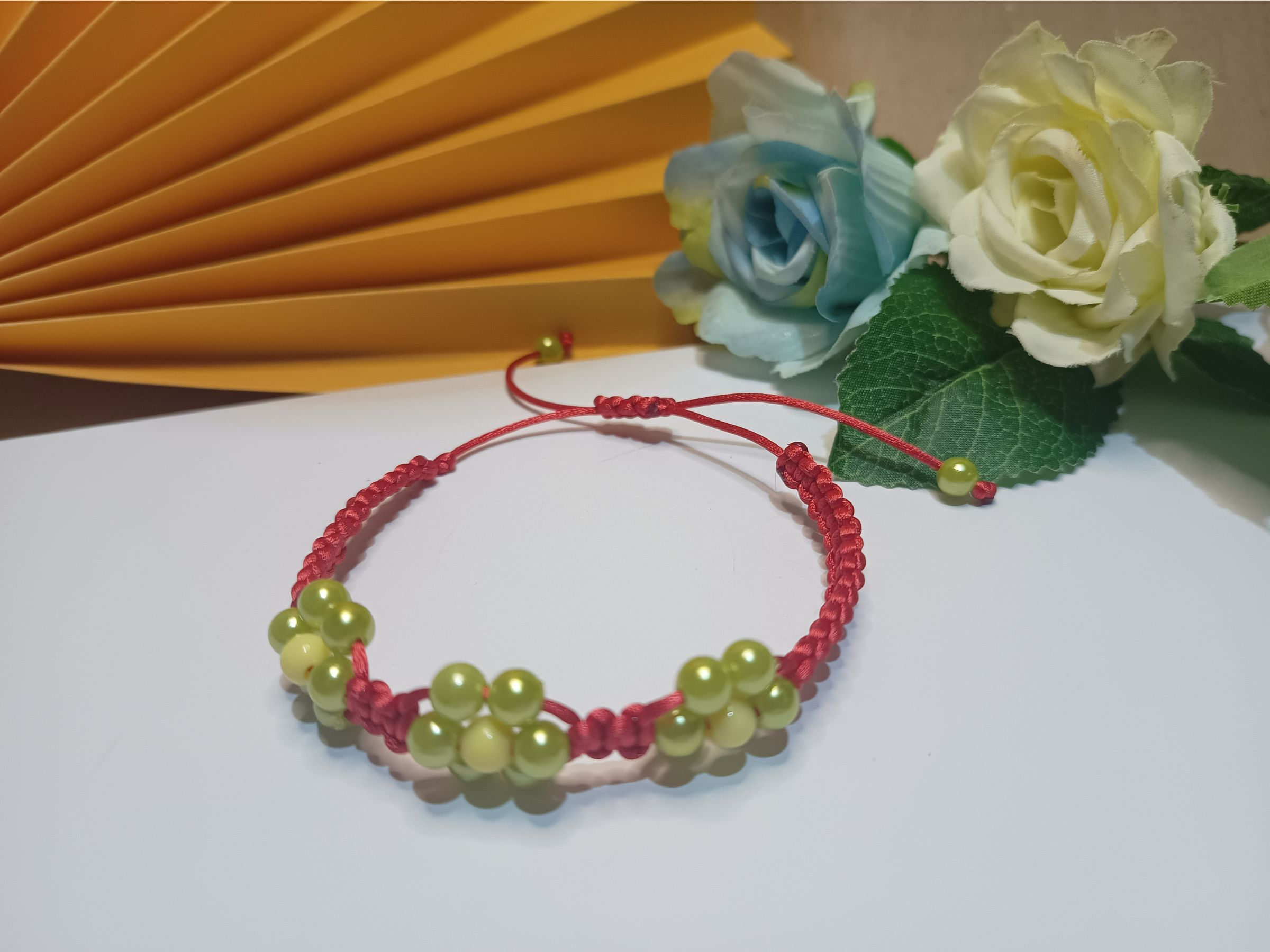 Pulseira trabalhada em macramê com fio de seda vermelho, 3 flores em pérolas na cor verde oliva com fecho ajustável